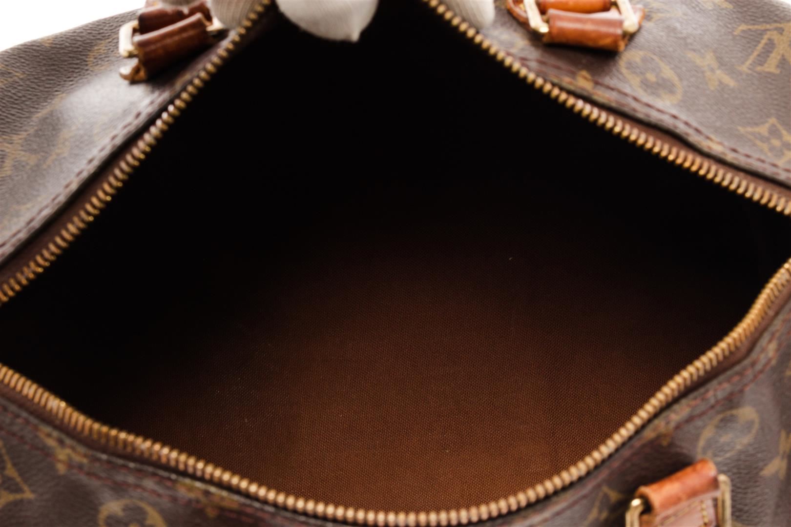 Louis Vuitton Brown Monogram Canvas Speedy 30 Satchel Bag. All available information is listed in the description and shown in the photos. Louis Vuitton Brown Monogram Canvas Speedy 30 Satchel Bag with brass hardware, leather trim, dual rolled handles, canvas lining & single interior pocket, zip closure at top. Height: 10.5" Width: 12" Depth: 6.5", Handle Drop: 3.5" / 26.67 x 30.48 x 16.51 Cm