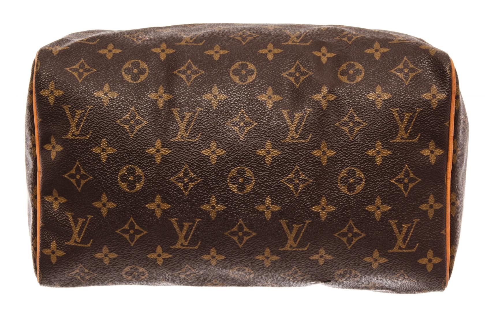 Louis Vuitton Brown Monogram Canvas Speedy 30 Satchel Bag. All available information is listed in the description and shown in the photos. Louis Vuitton Brown Monogram Canvas Speedy 30 Satchel Bag with brass hardware, leather trim, dual rolled handles, leather trim embellishment, canvas lining & single interior pocket, zip closure at top. Height: 8.5" Width: 12" Depth: 6.5", Handle Drop: 3.25" / 21.59 x 30.48 x 16.51 Cm