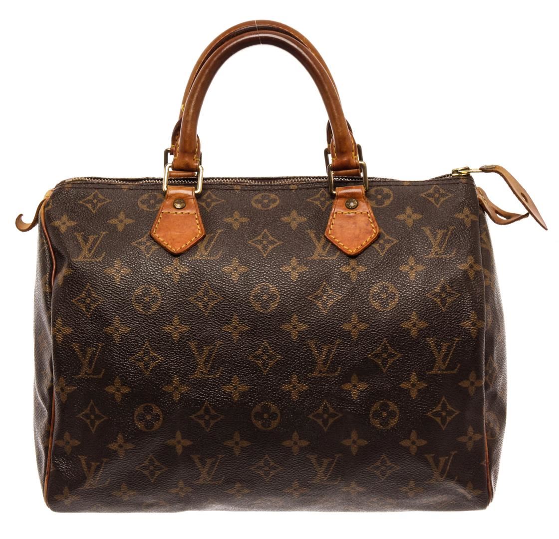 Louis Vuitton Brown Monogram Canvas Speedy 30 Satchel Bag. All available information is listed in the description and shown in the photos. Louis Vuitton Brown Monogram Canvas Speedy 30 Satchel Bag with brass hardware, leather trim, dual rolled handles, canvas lining & single interior pocket, zip closure at top. Height: 10.5" Width: 12" Depth: 6.5", Handle Drop: 3.5" / 26.67 x 30.48 x 16.51 Cm