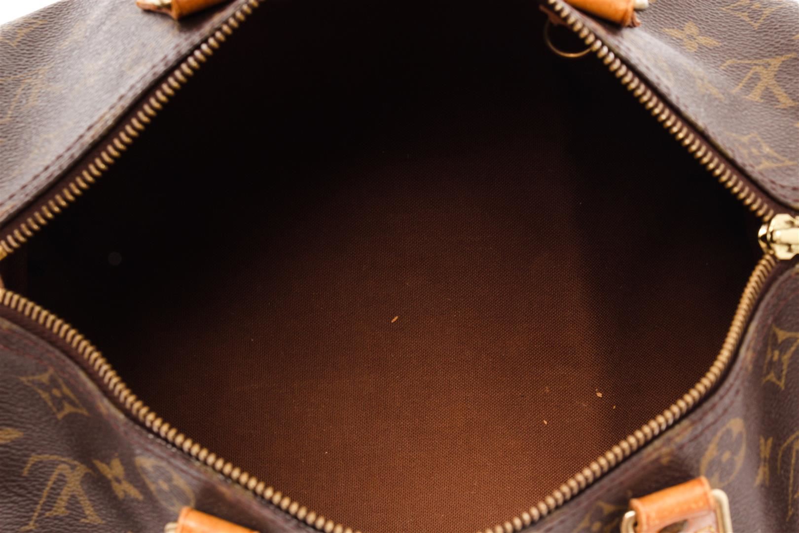 Louis Vuitton Brown Monogram Canvas Speedy 30 Satchel Bag. All available information is listed in the description and shown in the photos. Louis Vuitton Brown Monogram Canvas Speedy 30 Satchel Bag with brown & neutrals, brass hardware, leather trim, rolled handles, leather trim embellishment, grosgrain lining & single interior pocket, zip closure at top. Height: 8.25" Width: 11.75" Depth: 6.75", Handle Drop: 3" / 20.95 x 29.84 x 17.14 Cm