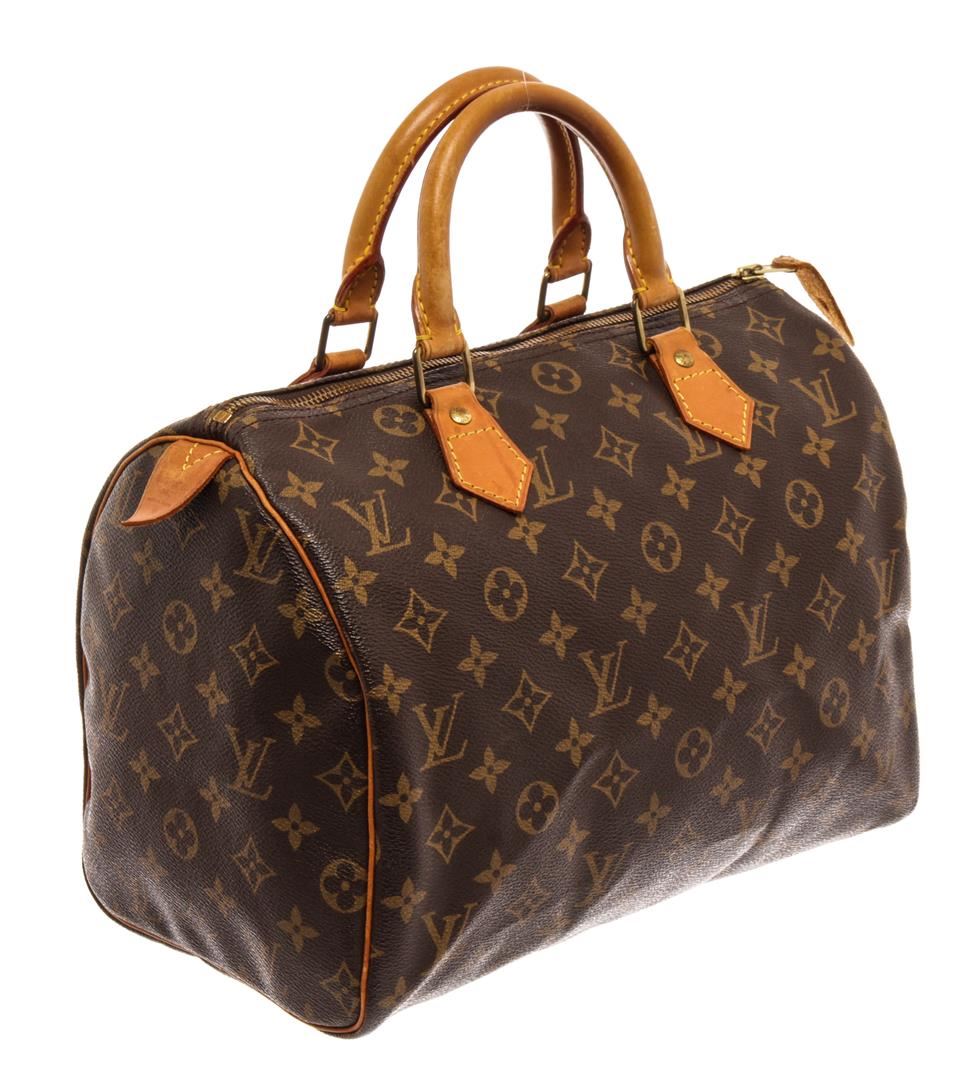 Louis Vuitton Brown Monogram Canvas Speedy 30 Satchel Bag. All available information is listed in the description and shown in the photos. Louis Vuitton Brown Monogram Canvas Speedy 30 Satchel Bag with brass hardware, leather trim, dual rolled handles, leather trim embellishment, canvas lining & single interior pocket, zip closure at top. Height: 8.5" Width: 12" Depth: 7", Handle Drop: 4" / 21.59 x 30.48 x 17.78 Cm