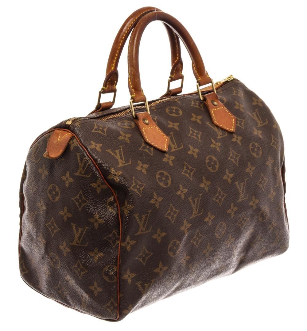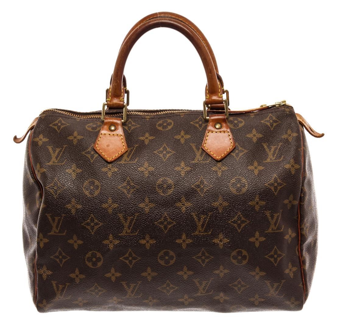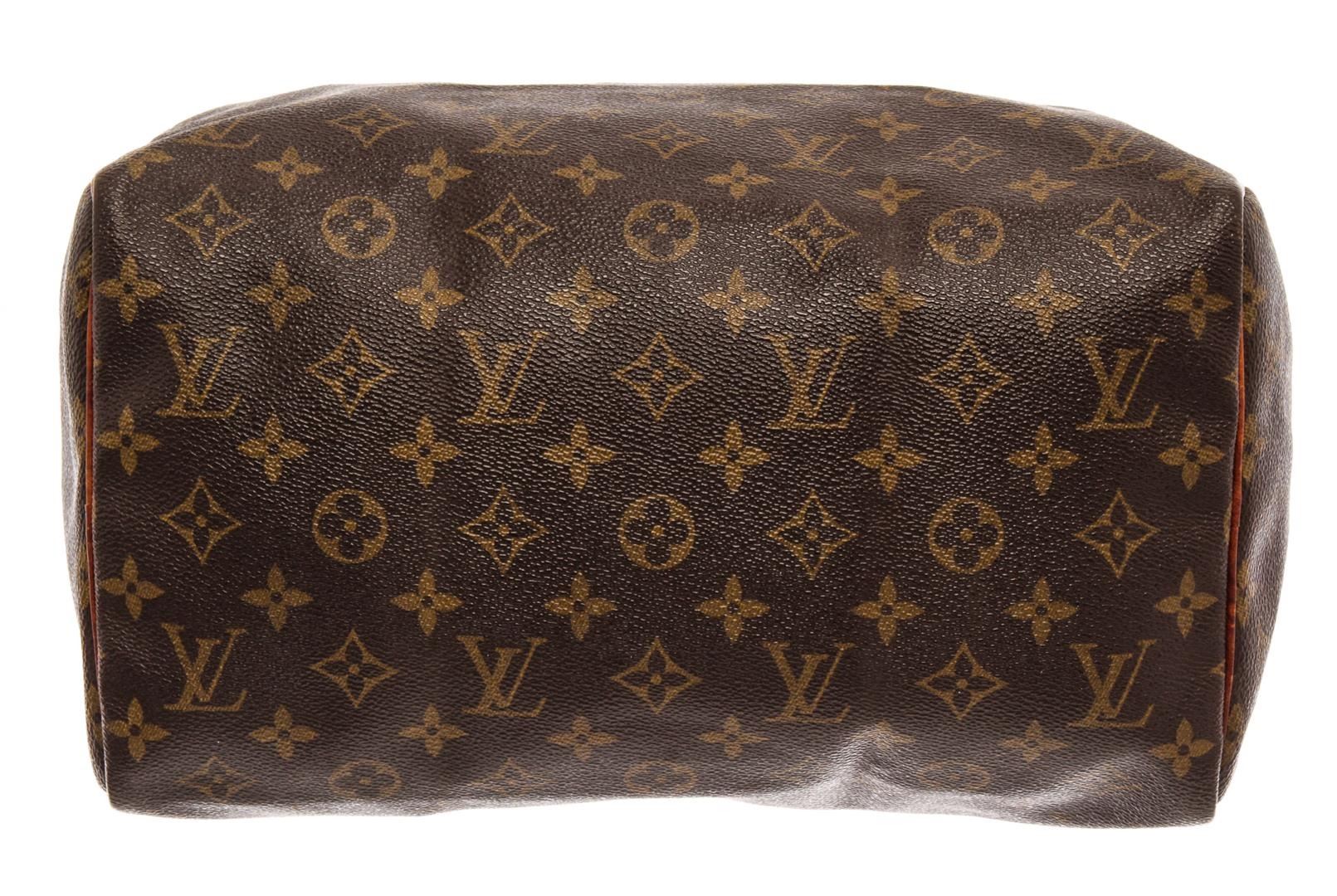 Louis Vuitton Brown Monogram Canvas Speedy 30 Satchel Bag. All available information is listed in the description and shown in the photos. Louis Vuitton Brown Monogram Canvas Speedy 30 Satchel Bag with brass hardware, leather trim, rolled handles, canvas lining & single interior pocket, zip closure at top. Height: 10" Width: 12" Depth: 6.75", Handle Drop: 3" / 25.4 x 30.48 x 17.14 Cm