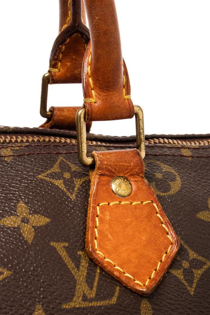 Louis Vuitton Brown Monogram Canvas Speedy 30 Satchel Bag. All available information is listed in the description and shown in the photos. Louis Vuitton Brown Monogram Canvas Speedy 30 Satchel Bag with brass hardware, leather trim, dual rolled handles, canvas lining & single interior pocket, zip closure at top. Height: 10.5" Width: 12" Depth: 6.5", Handle Drop: 3.5" / 26.67 x 30.48 x 16.51 Cm