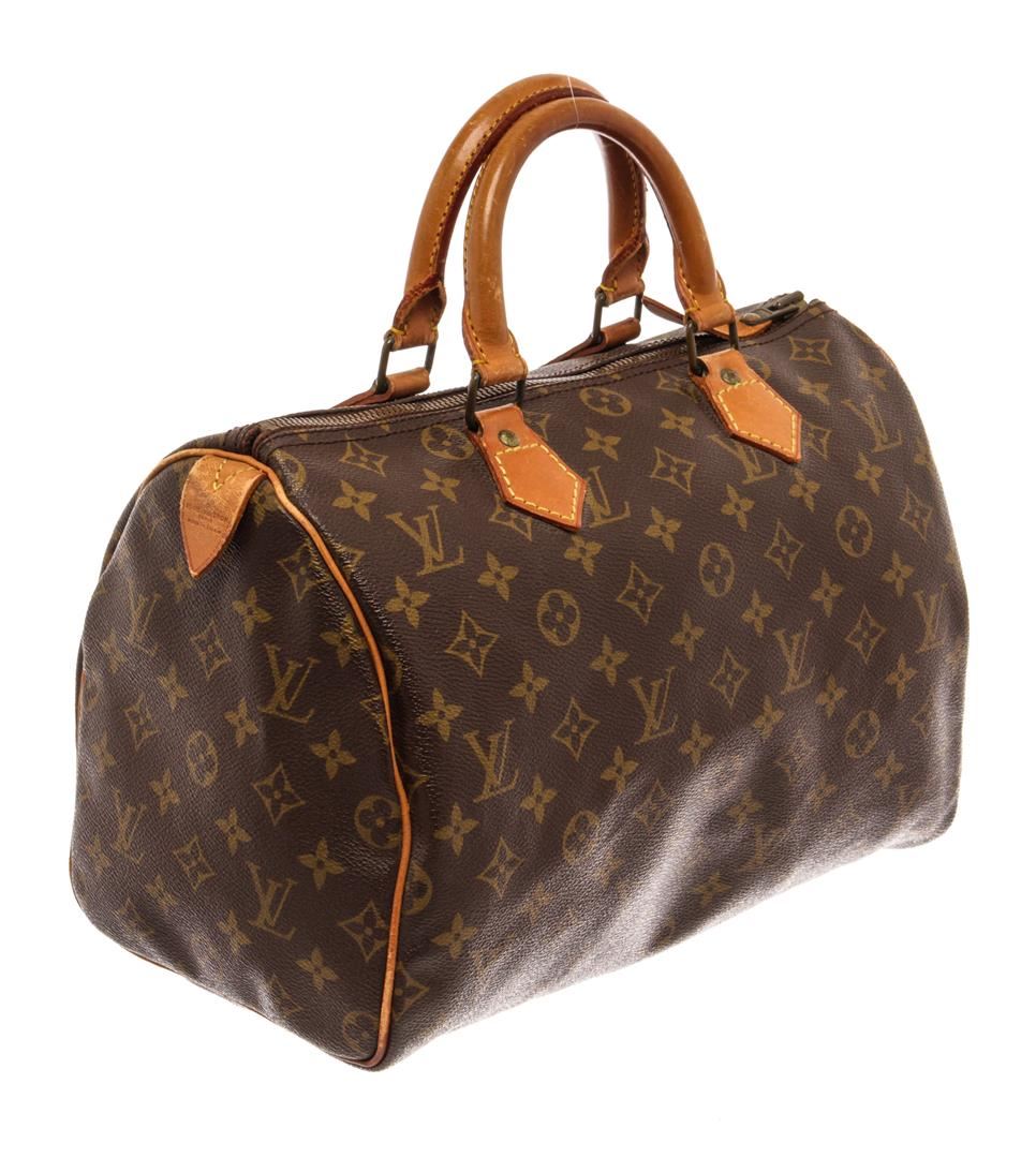 Louis Vuitton Brown Monogram Canvas Speedy 30cm Satchel Bag. All available information is listed in the description and shown in the photos. Louis Vuitton Brown Monogram Canvas Speedy 30cm Satchel Bag with gold-tone hardware, leather trim, rolled handles, leather trim embellishment, canvas lining & single interior pocket, zip closure at top. Height: 8.75" Width: 11.75" Depth: 7", Handle Drop: 3.5" / 22.22 x 29.84 x 17.78 Cm