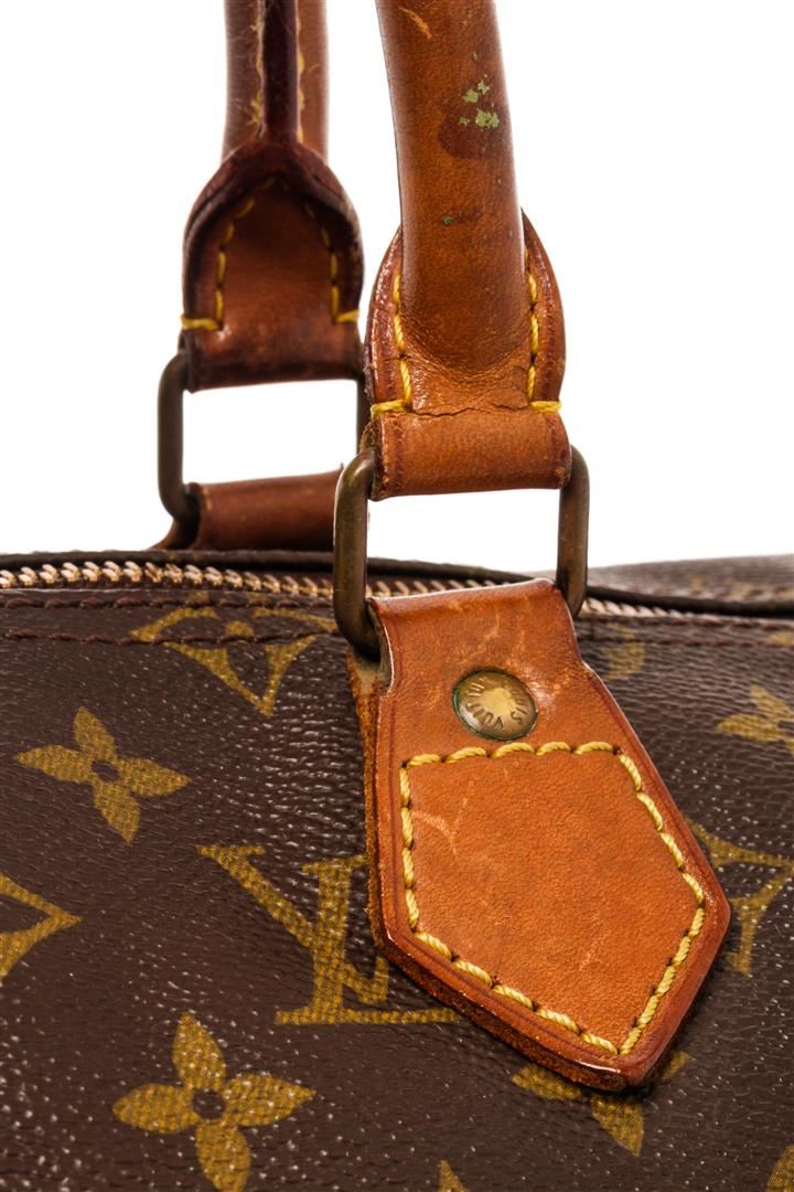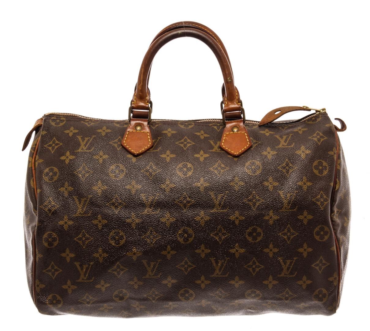 Louis Vuitton Brown Monogram Canvas Speedy 35 Satchel Bag. All available information is listed in the description and shown in the photos. Louis Vuitton Brown Monogram Canvas Speedy 35 Satchel Bag with brown coated canvas, brass hardware, dual rolled handles, leather trim embellishment, canvas lining & single interior pocket, zip closure at top. Height: 10.25" Width: 13.75" Depth: 7", Handle Drop: 3.75" / 26.03 x 34.92 x 17.78 Cm