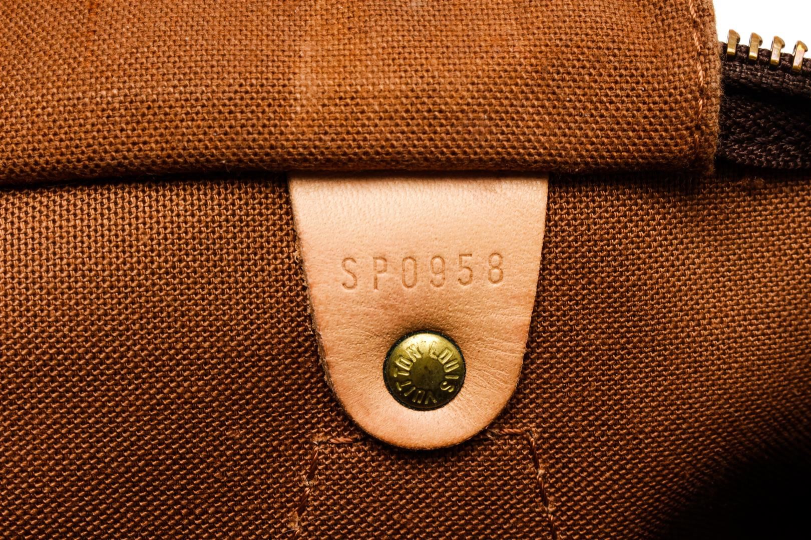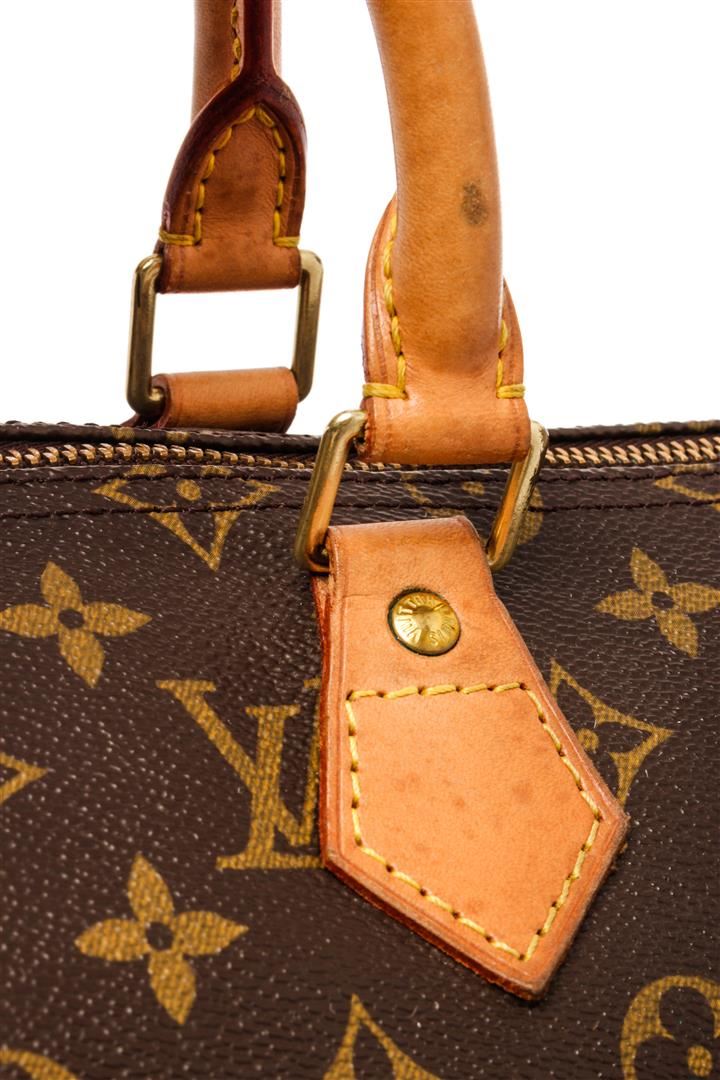 Louis Vuitton Brown Monogram Canvas Speedy 35 Satchel Bag. All available information is listed in the description and shown in the photos. Louis Vuitton Brown Monogram Canvas Speedy 35 Satchel Bag with brass hardware, leather trim, rolled handles, leather trim embellishment, canvas lining & single interior pocket, zip closure at top. Height: 9" Width: 14" Depth: 7.5", Handle Drop: 3.5" / 22.86 x 35.56 x 19.05 Cm