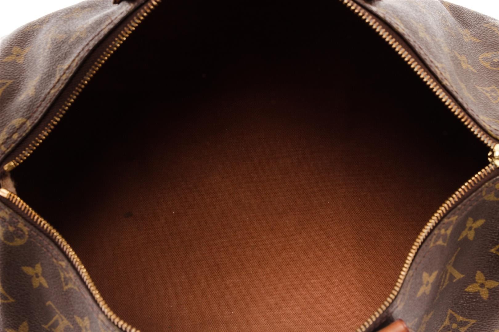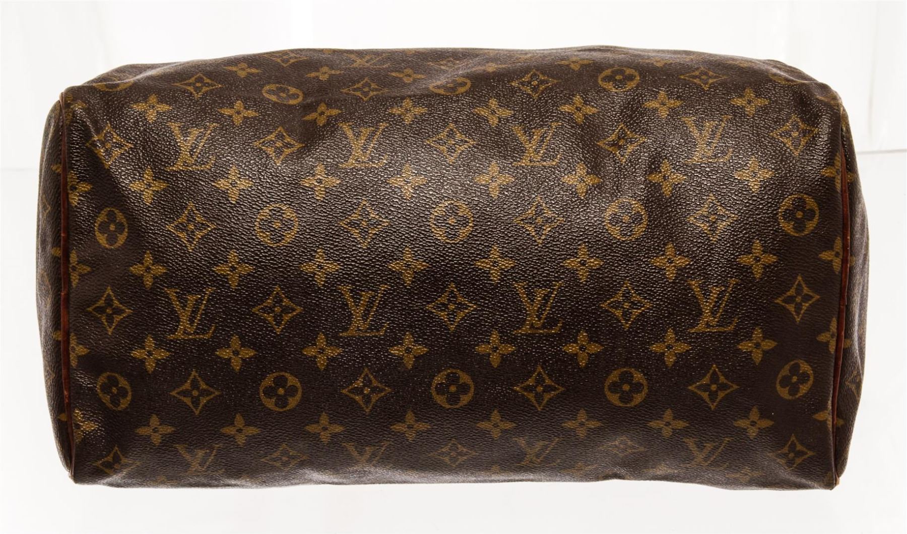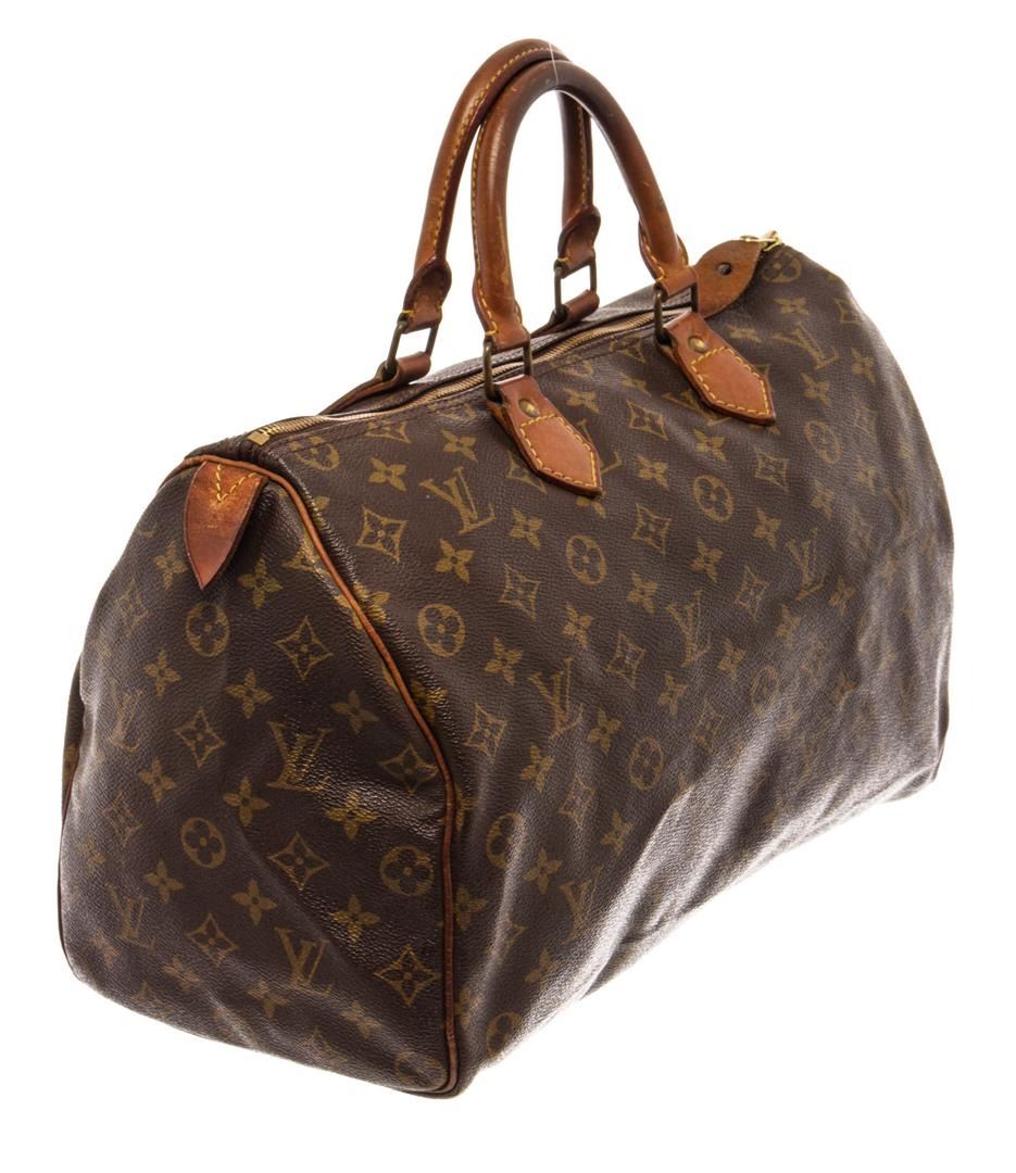 Louis Vuitton Brown Monogram Canvas Speedy 35 Satchel Bag. All available information is listed in the description and shown in the photos. Louis Vuitton Brown Monogram Canvas Speedy 35 Satchel Bag with brown coated canvas, brass hardware, dual rolled handles, leather trim embellishment, canvas lining & single interior pocket, zip closure at top. Height: 10.25" Width: 13.75" Depth: 7", Handle Drop: 3.75" / 26.03 x 34.92 x 17.78 Cm