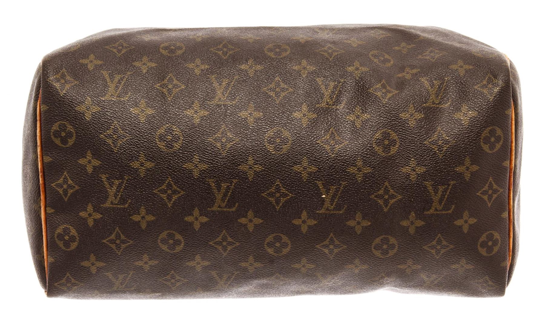 Louis Vuitton Brown Monogram Canvas Speedy 35 Satchel Bag. All available information is listed in the description and shown in the photos. Louis Vuitton Brown Monogram Canvas Speedy 35 Satchel Bag with brass hardware, dual rolled handles, leather trim embellishment, canvas lining & single interior pocket, zip closure at top. Height: 10.75" Width: 13" Depth: 7", Handle Drop: 3.75" / 27.30 x 33.02 x 17.78 Cm
