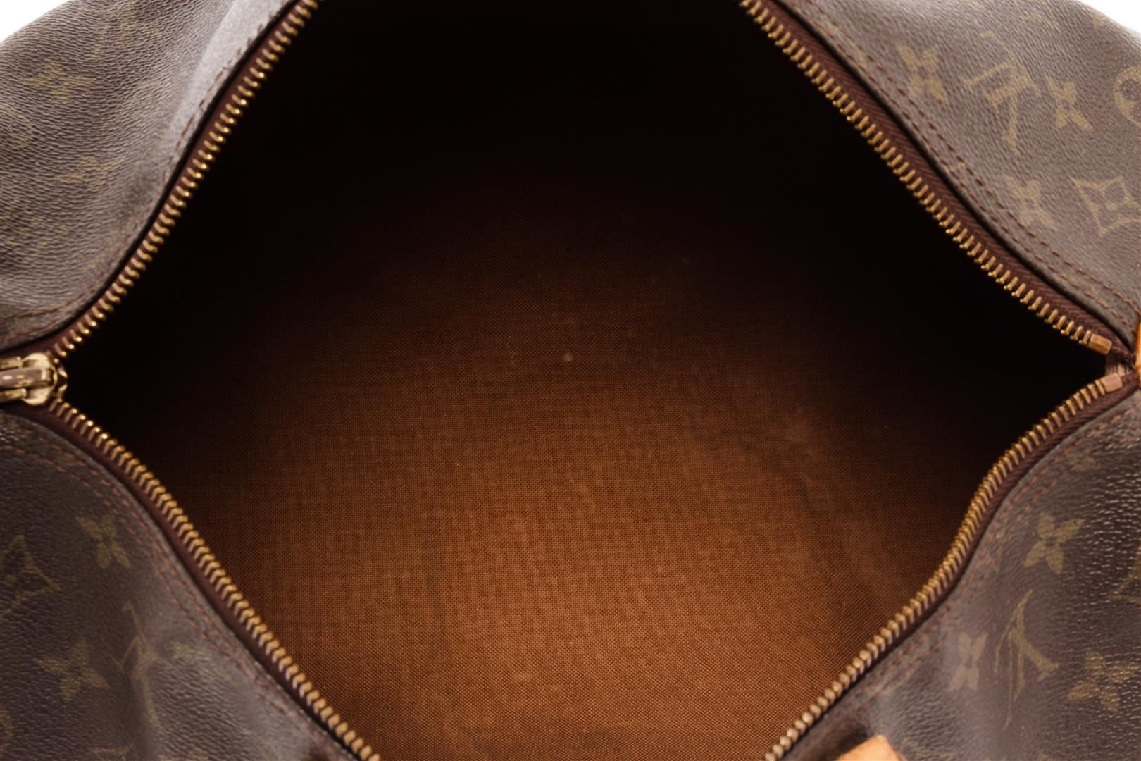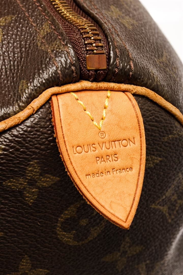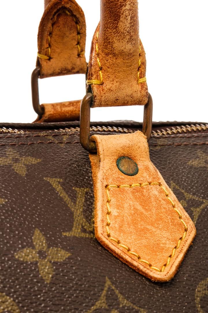 Louis Vuitton Brown Monogram Canvas Speedy 35 Satchel Bag. All available information is listed in the description and shown in the photos. Louis Vuitton Brown Monogram Canvas Speedy 35 Satchel Bag with brass hardware, dual rolled handles, leather trim embellishment, canvas lining & single interior pocket, zip closure at top. Height: 10.75" Width: 13" Depth: 7", Handle Drop: 3.75" / 27.30 x 33.02 x 17.78 Cm