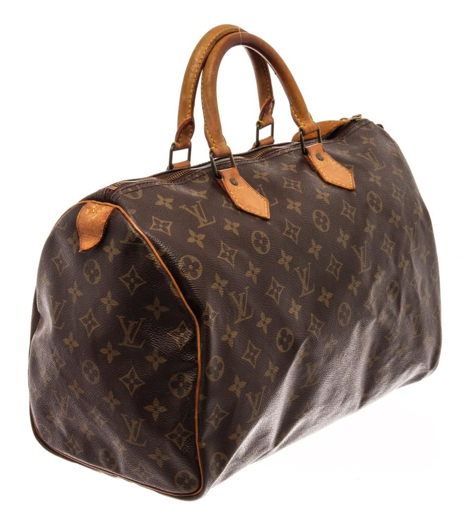 Louis Vuitton Brown Monogram Canvas Speedy 35 Satchel Bag. All available information is listed in the description and shown in the photos. Louis Vuitton Brown Monogram Canvas Speedy 35 Satchel Bag with brown & neutrals, monogram pattern, brass hardware, leather trim, dual rolled handles, leather trim embellishment, canvas lining & single interior pocket, zip closure at top. Height: 10.5" Width: 12" Depth: 7", Handle Drop: 3.5" / 26.67 x 30.48 x 17.78 Cm
