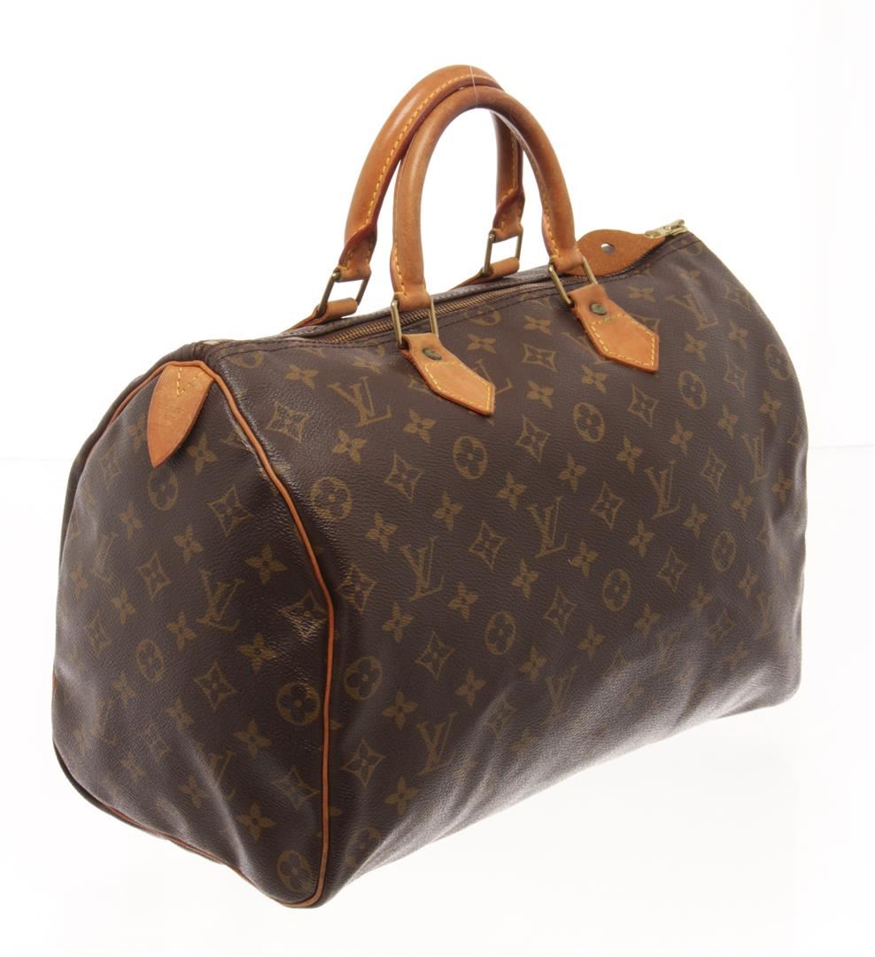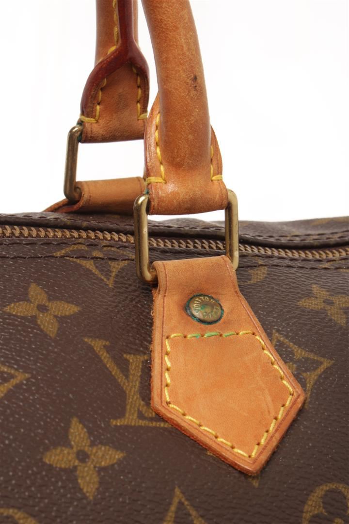 Louis Vuitton Brown Monogram Canvas Speedy 35 Satchel Bag. All available information is listed in the description and shown in the photos. louis vuitton brown monogram canvas speedy 35 bandoulie satchel bag with gold-tone hardware, internal slip pocket, leather trim, two rolled top handles, main compartment top zip fastening. Depth 7.9 in, Handle 3.9 in, Height 9.1 in, Width 13.8 in / Depth 20 cm, Handle 10 cm, Height 23 cm, Width 35 cm
