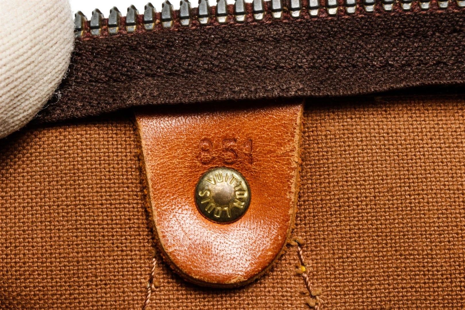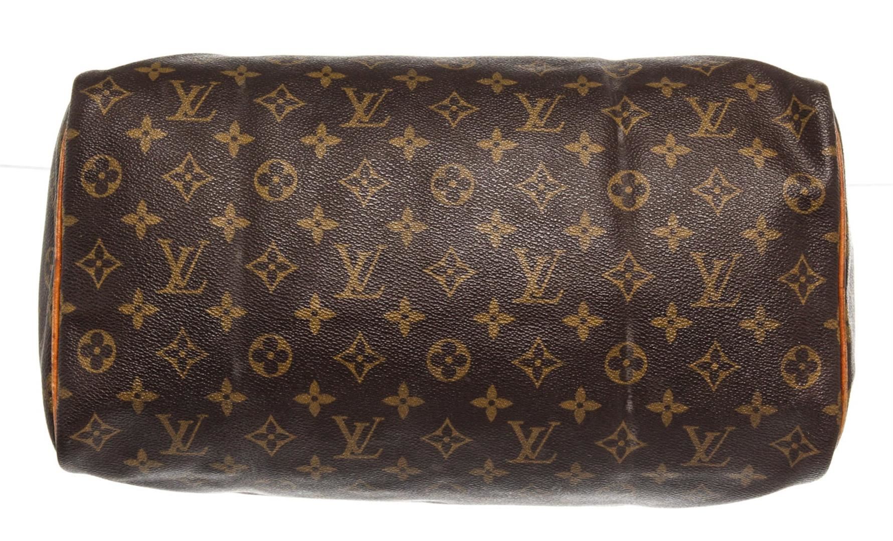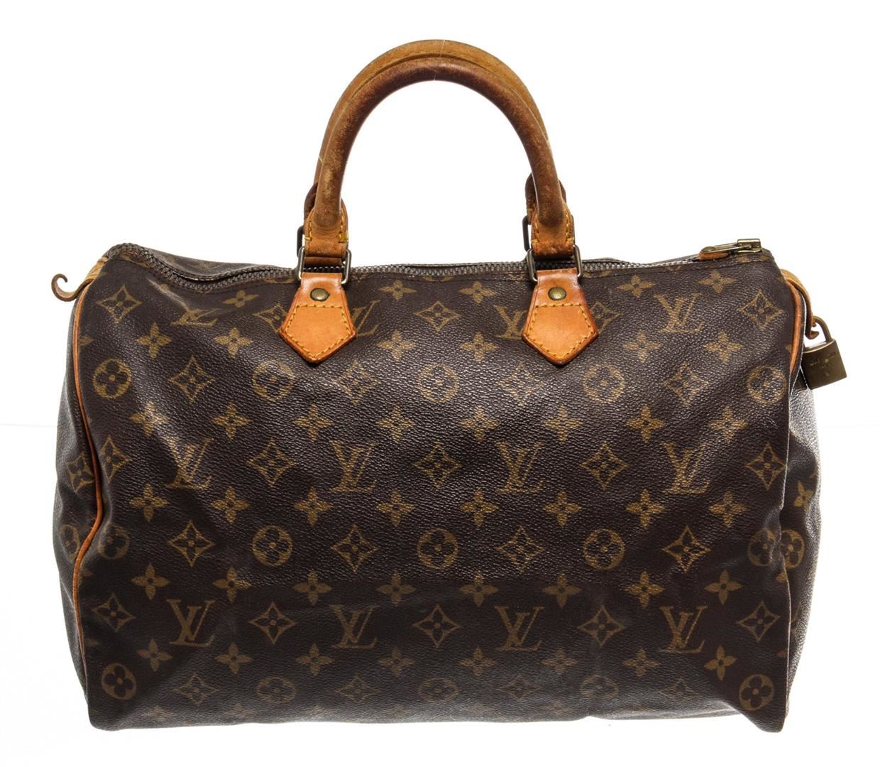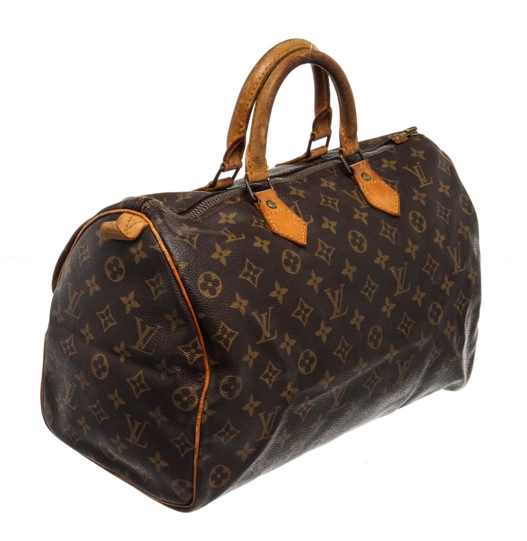 Louis Vuitton Brown Monogram Canvas Speedy 35cm Satchel Bag with monogram canvas gold-tone hardware, trim tan vachetta leather, interior slip pocket, dual top handle and zipper closure.