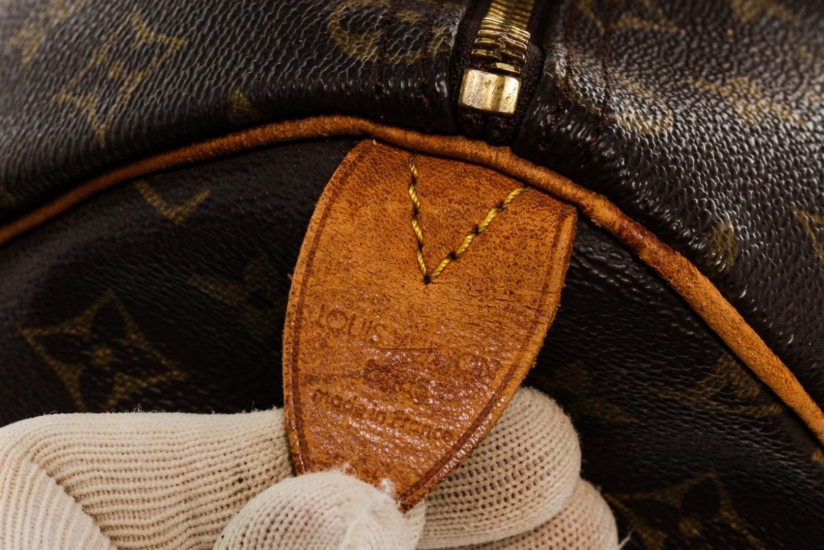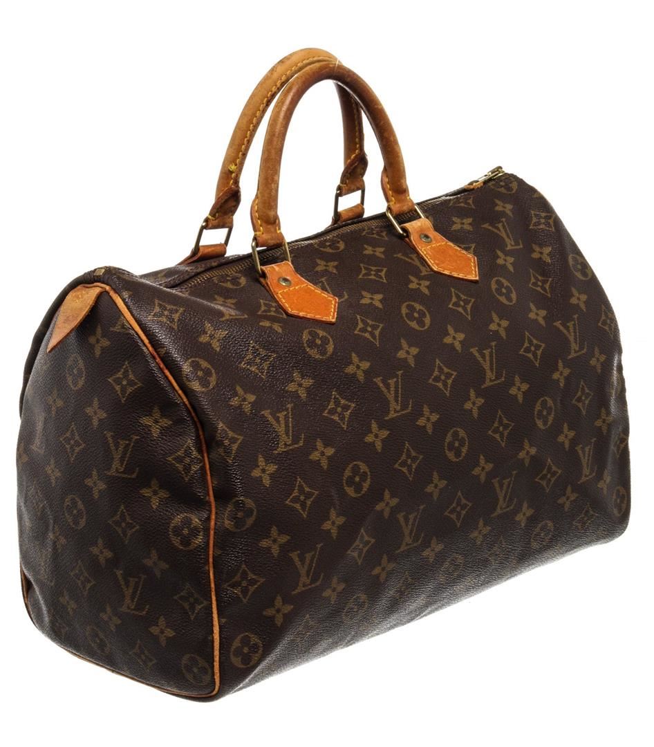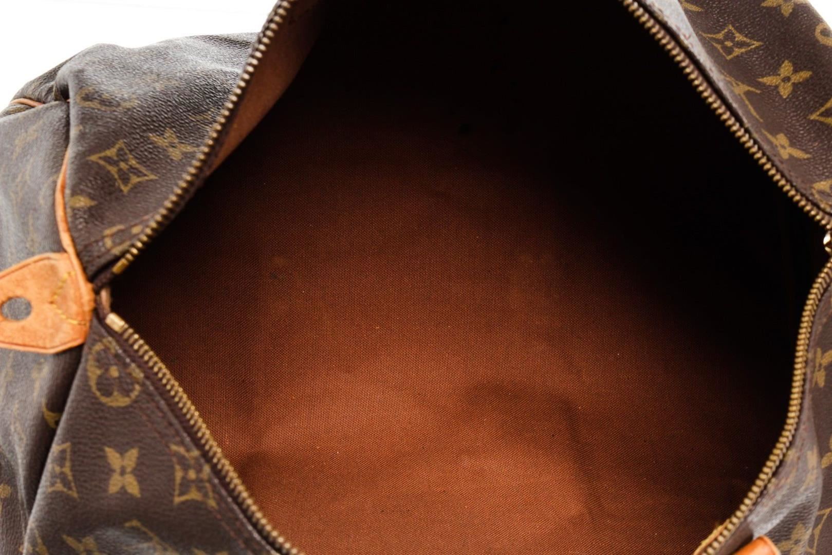 Louis Vuitton Brown Monogram Canvas Speedy 35cm Satchel Bag with monogram canvas gold-tone hardware, trim tan vachetta leather, interior slip pocket, dual top handle and zipper closure. 53856MSC