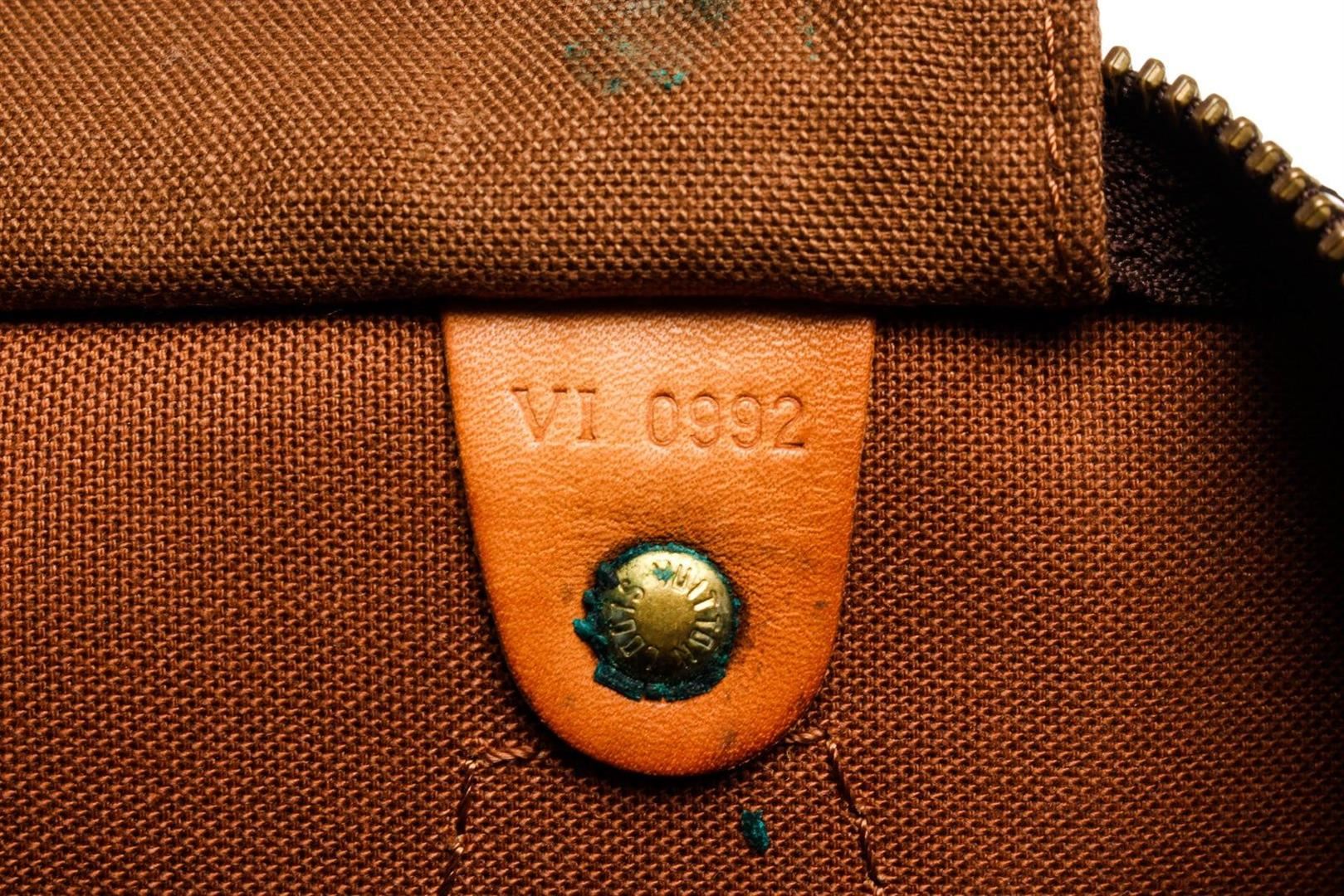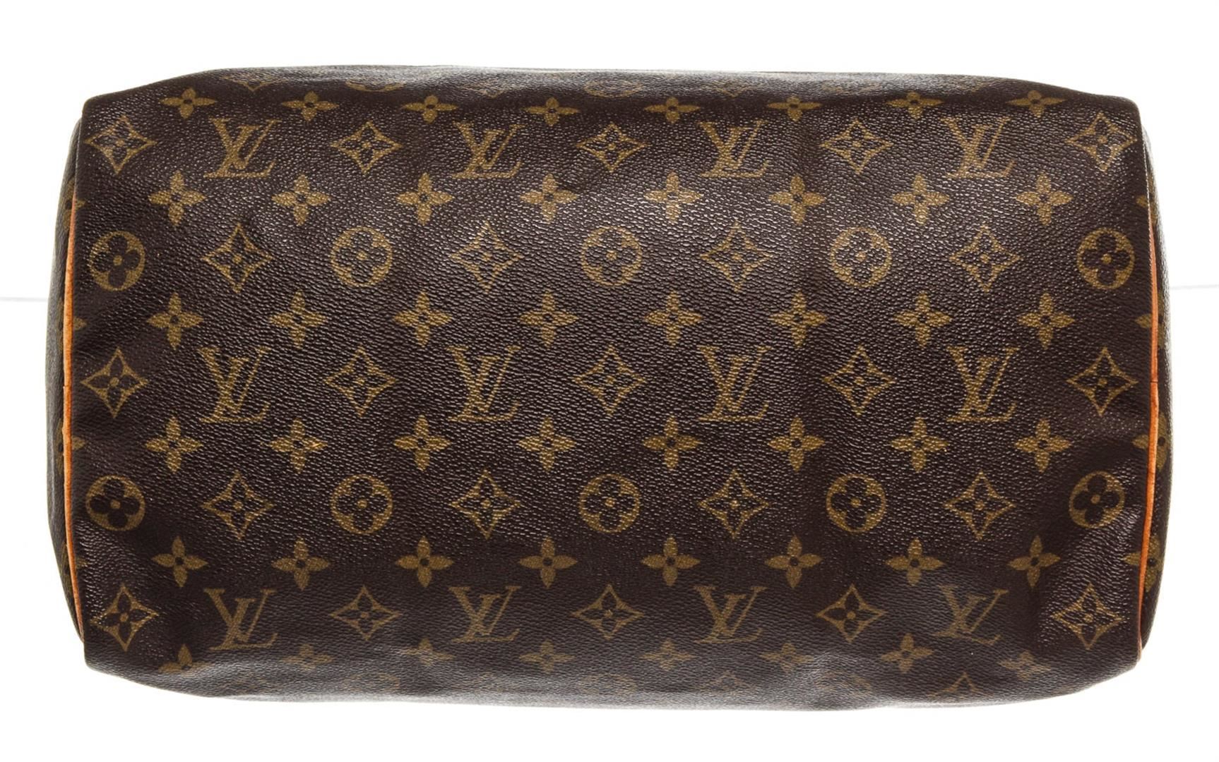 Louis Vuitton Brown Monogram Canvas Speedy 35cm Satchel Bag with monogram canvas gold-tone hardware, trim tan vachetta leather, interior slip pocket, dual top handle and zipper closure. 53856MSC
