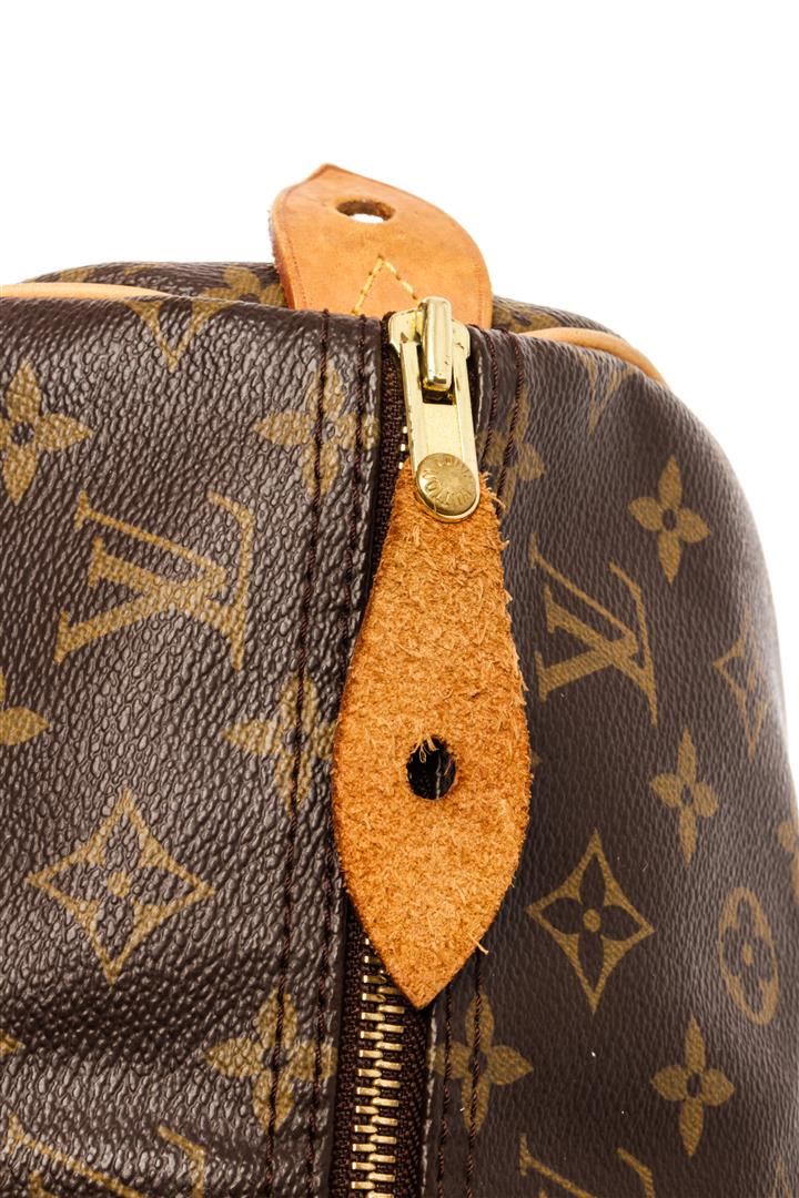 Louis Vuitton Brown Monogram Canvas Speedy 40 Satchel Bag. All available information is listed in the description and shown in the photos. Louis Vuitton Brown Monogram Canvas Speedy 40 Satchel Bag with brass hardware, leather trim, dual rolled leather top handles & dual shoulder straps, leather trim embellishment, canvas lining & single interior pocket, zip closure at top. Height: 14" Width: 15" Depth: 8", Handle Drop: 4" / 35.56 x 38.1 x 20.32 Cm