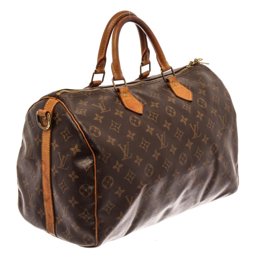 Louis Vuitton Brown Monogram Canvas Speedy Bandouliere 35 Satchel Bag. All available information is listed in the description and shown in the photos. Louis Vuitton Brown Monogram Canvas Speedy Bandouliere 35 Satchel Bag with brass hardware, leather trim, dual rolled handles & single adjustable shoulder strap, leather trim embellishment, canvas lining & single interior pocket, zip closure at top. Height: 9.75" Width: 13.75" Depth: 7", Handle Drop: 3.5", Shoulder Strap Drop: 19.5" / 24.76 x 34.92 x 17.78 Cm