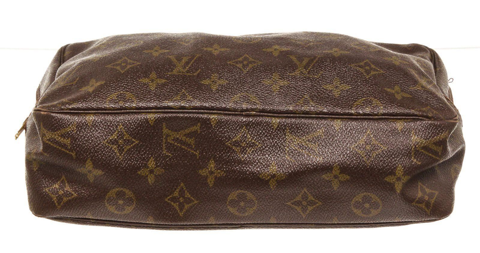 Louis Vuitton Brown Monogram Canvas Toiletry 28cm Cosmetic Bag with brass hardware, creme coated canvas lining, single slit pocket, three elasticized compartments and zip-around closure.
