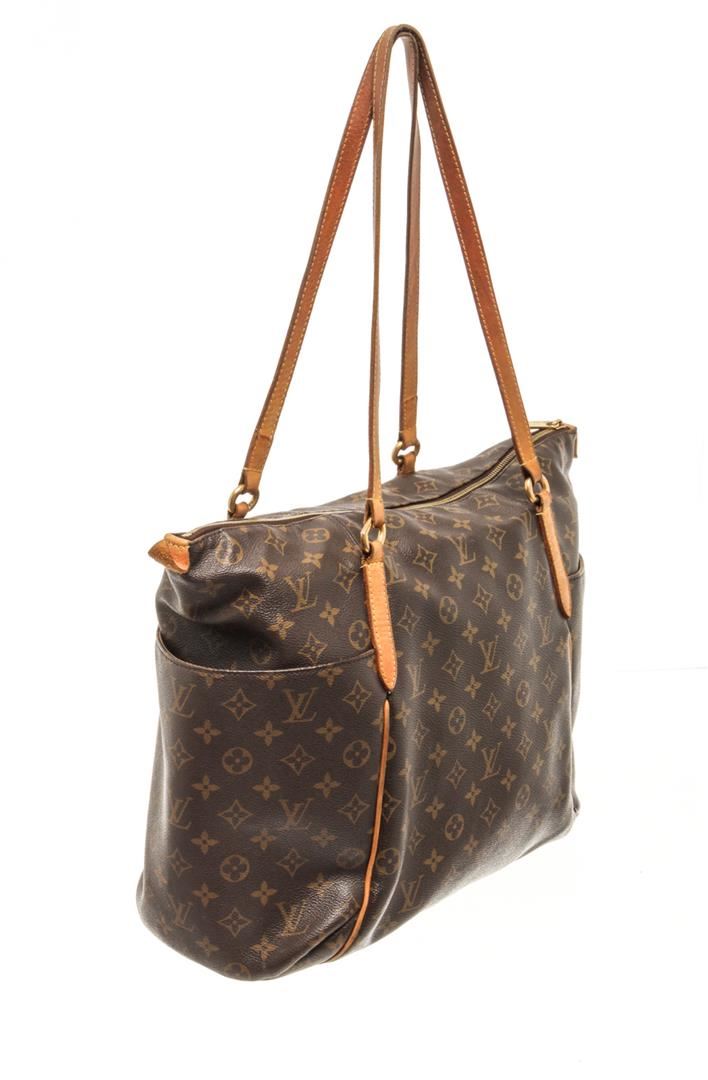 One Louis Vuitton Brown Monogram Canvas Totally GM Shoulder Bag. Item is sold AS-IS. All available information is listed in the description and shown in the photo. Louis Vuitton Brown Monogram Canvas Totally GM Shoulder Bag with brass hardware, tan vachetta leather trim, dual flat shoulder straps, dual exterior slit pockets at sides, brown woven interior lining, three interior slit pockets, zip closure at top. There are some stains on the lining. Please refer to photos. L 18" x H 13.5" x W 6.5" / 45.72 x 34.29 x 16.51 cm