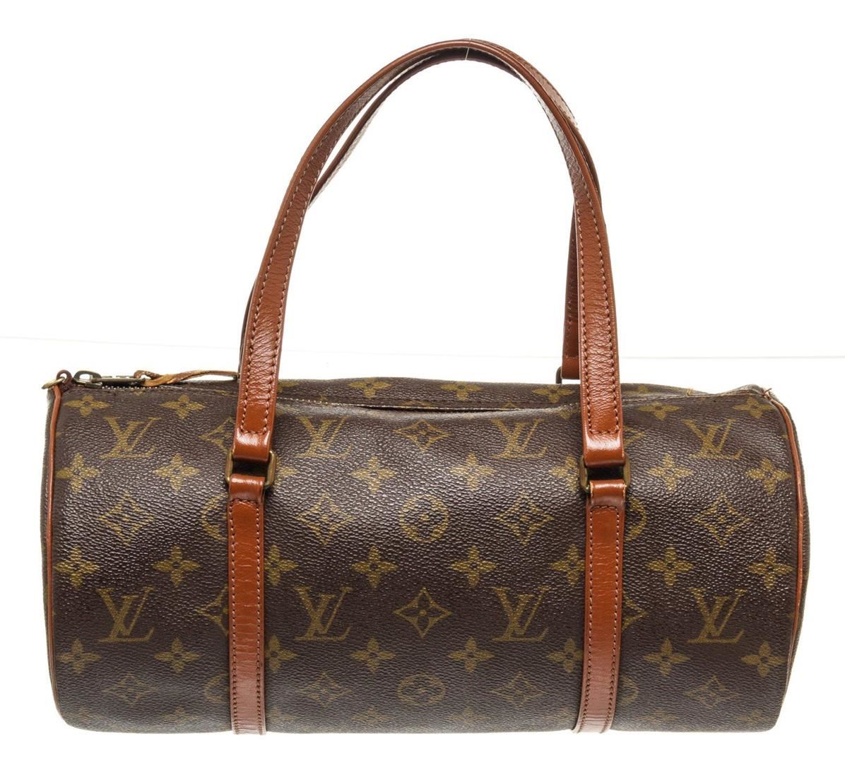 Louis Vuitton Brown Monogram Canvas Vintage Papillon 30cm Bag with gold-tone hardware, brown vintage leather trim, dual top handles, brown leather interior lining, and zipper closure at top.