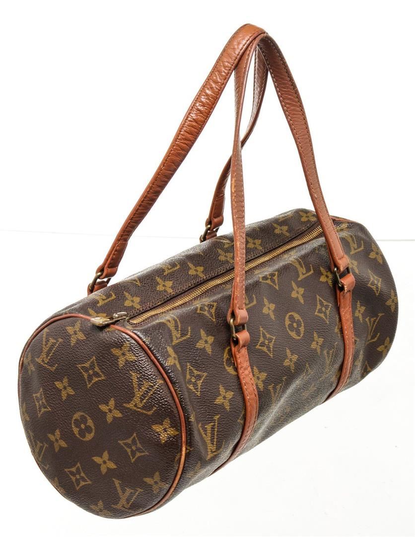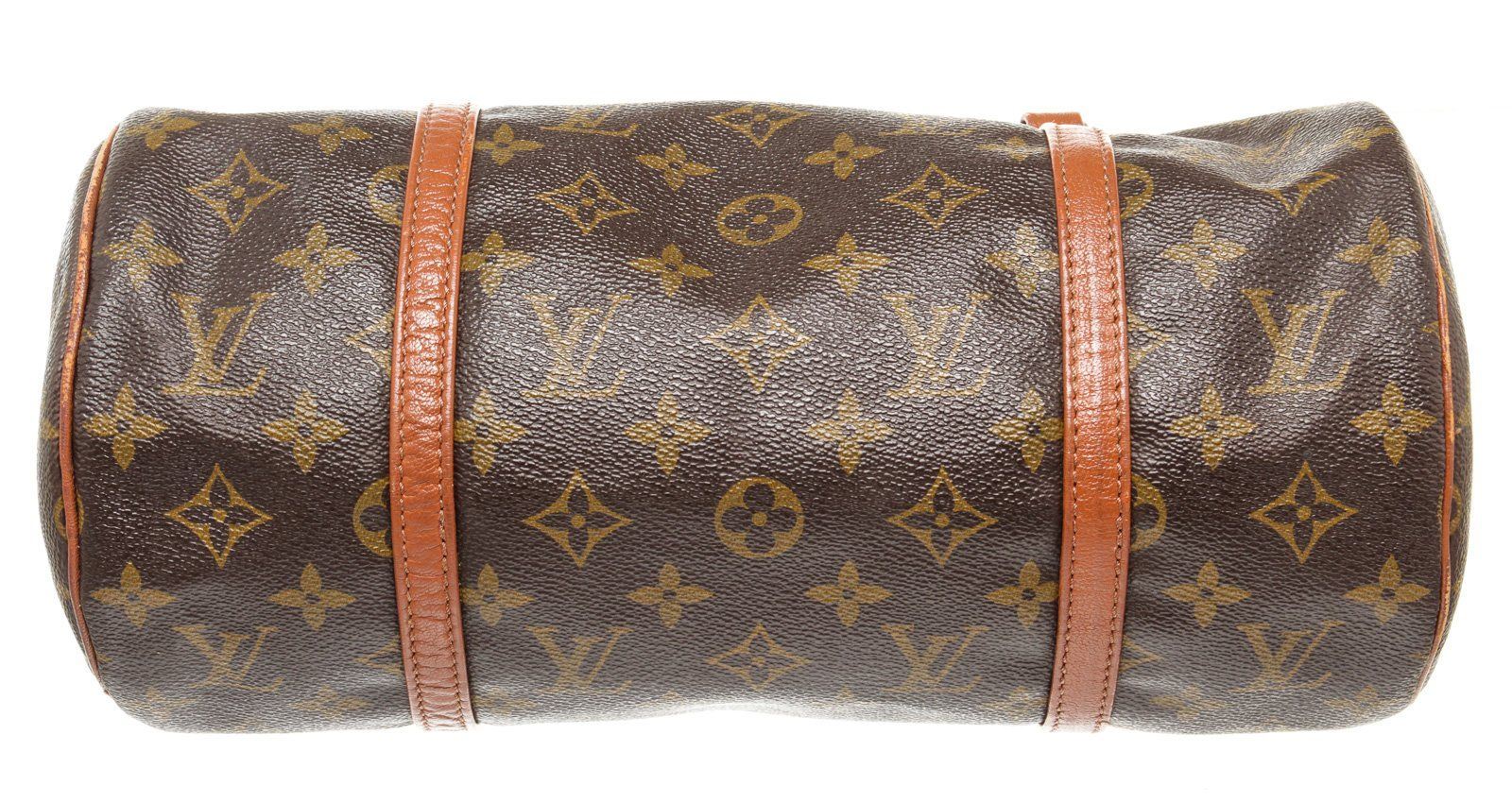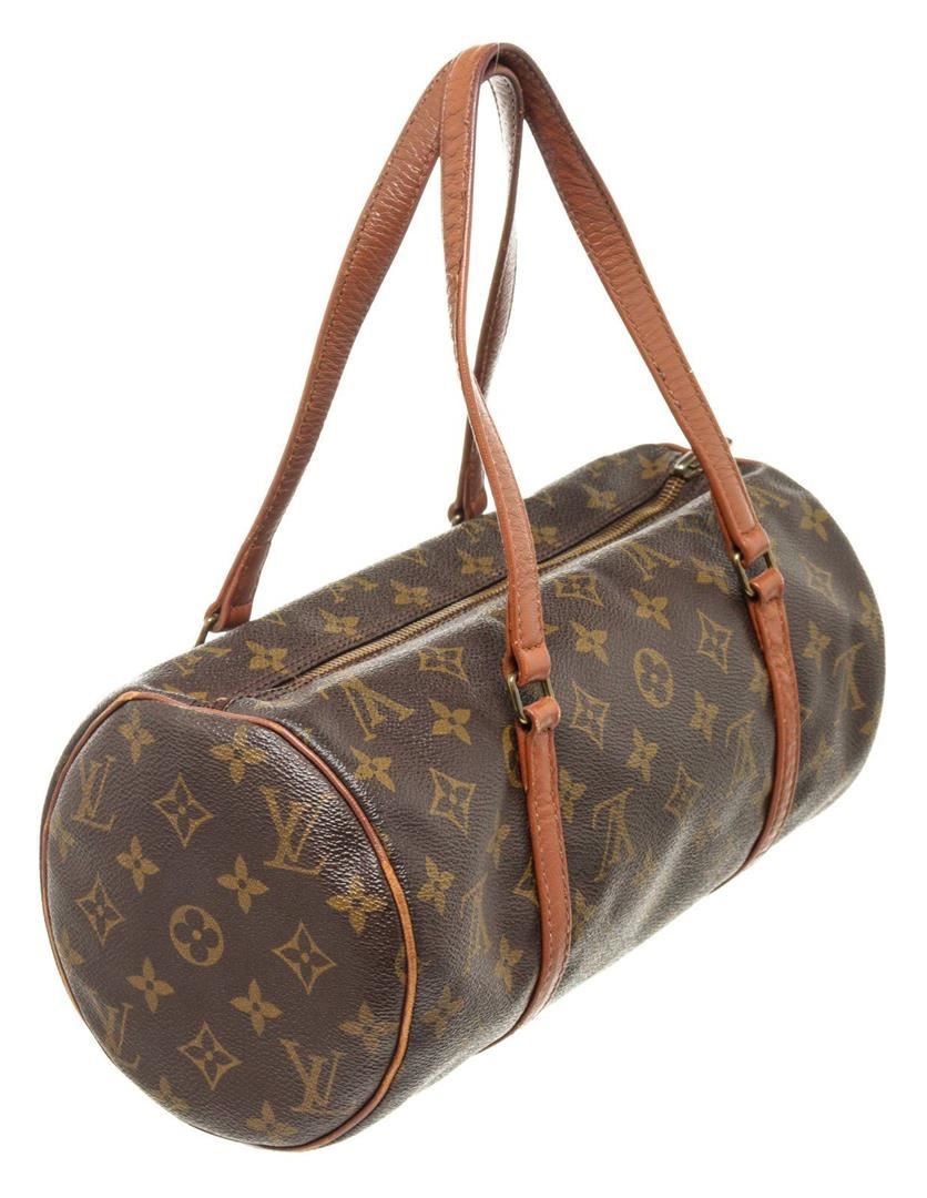 Louis Vuitton Brown Monogram Canvas Papillon 30cm Handbag with damier canvas, gold-tone hardware, trim tan vachetta leather, shoulder strap and zipper closure.