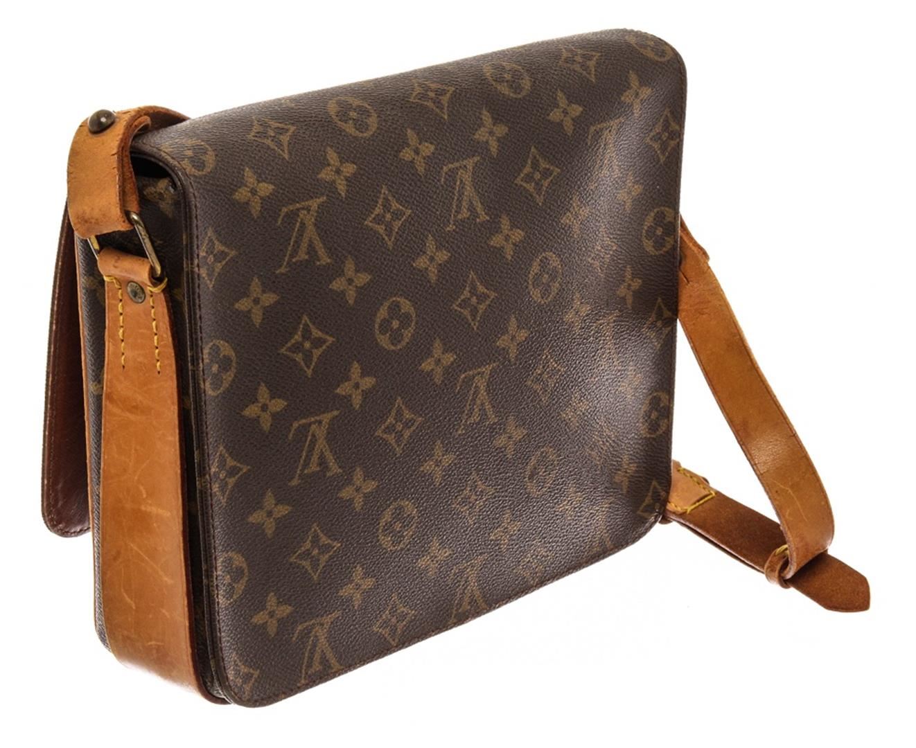 Louis Vuitton Brown Monogram Cartouchiere GM Messenger Bag. All available information is listed in the description and shown in the photos. Louis Vuitton Brown Monogram Cartouchiere GM Messenger Bag with brown printed, brass hardware, single adjustable shoulder strap, leather lining, buckle closure at front. Height: 9.25" Width: 10.25" Depth: 3", Shoulder Strap Drop Max: 21.5" / 23.49 x 26.03 x 7.62 Cm