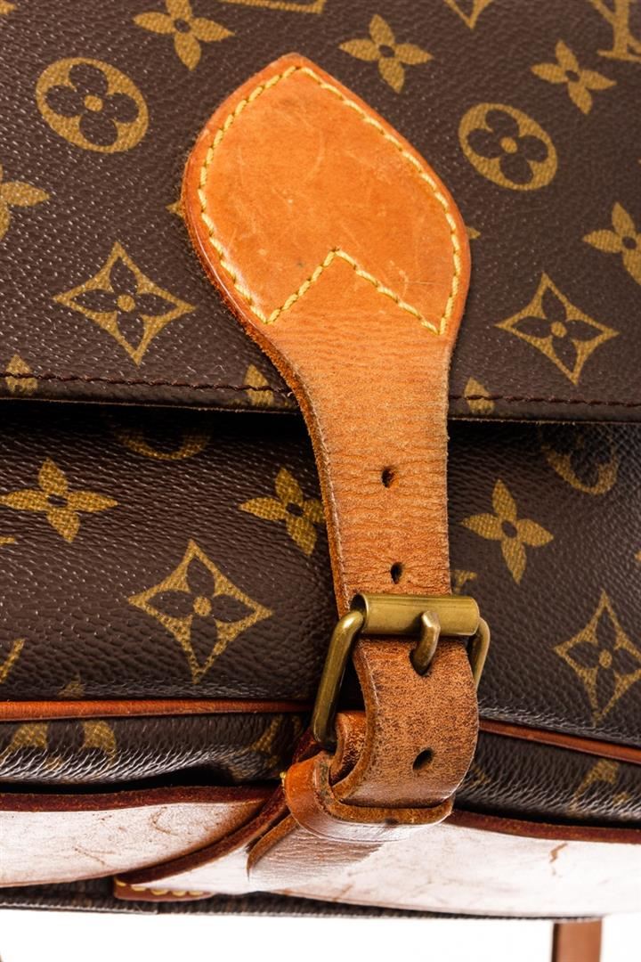 Louis Vuitton Brown Monogram Cartouchiere GM Messenger Bag. All available information is listed in the description and shown in the photos. Louis Vuitton Brown Monogram Cartouchiere GM Messenger Bag with brown printed, brass hardware, single adjustable shoulder strap, leather lining, buckle closure at front. Height: 9.25" Width: 10.25" Depth: 3", Shoulder Strap Drop Max: 21.5" / 23.49 x 26.03 x 7.62 Cm
