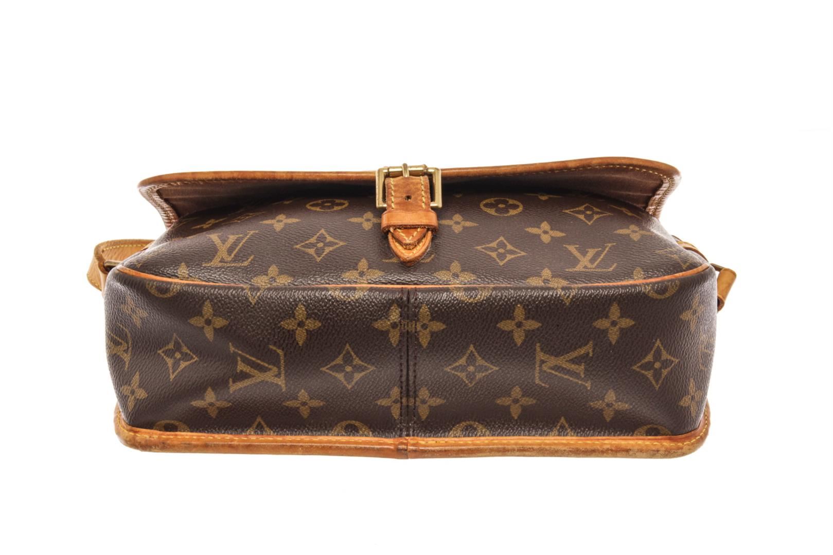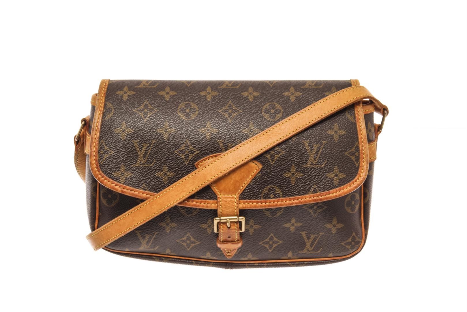 Louis Vuitton Brown Monogram Coated Canvas Sologne Bag. All available information is listed in the description and shown in the photos. Louis Vuitton Brown Monogram Coated Canvas Sologne Bag with brass hardware, tan vachetta leather trim, adjustable flat shoulder strap featuring shoulder pad, exterior slip pocket at back, single pocket at flap underside, brown canvas lining, single zip pocket at interior wall and buckle closure at front flap. Depth 3.1 in, Width 10.2 in/ Depth 8 cm, Width 26 cm