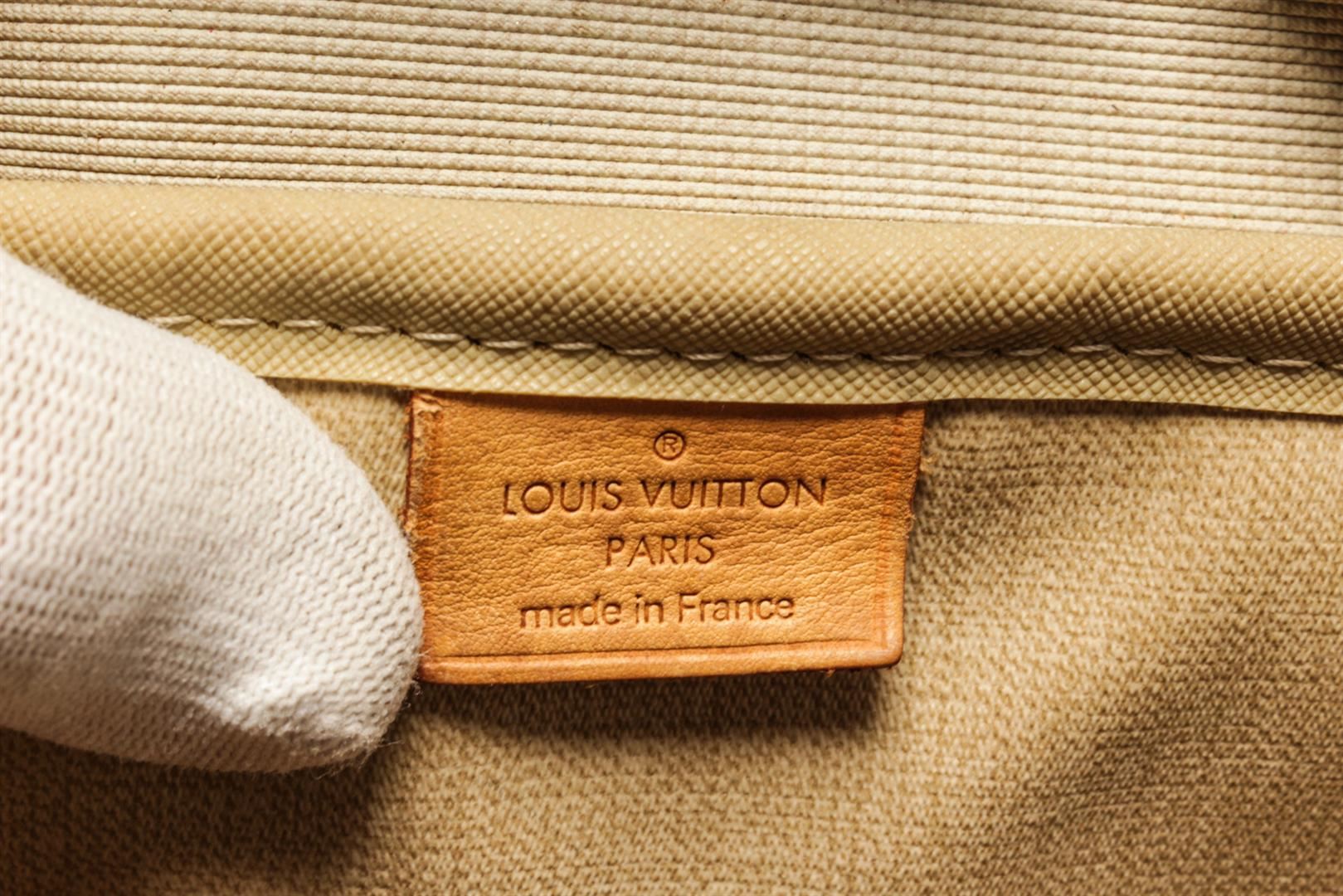 One Louis Vuitton Brown Monogram Deauville Bag. Item is sold AS-IS. All available information is listed in the description and shown in the photo. Louis Vuitton Brown Monogram Deauville Bag with top handle, exterior pocket, two interior slip pockets, canvas lining, gold tone hardware, zipper closure. There are some stains on the canvas lining and wear on the vachetta. Please refer to photos. Height: 9.1" Width: 13" Depth: 4.7", Handle Drop: 3.5" / 23.11 x 33.02 x 11.93 Cm