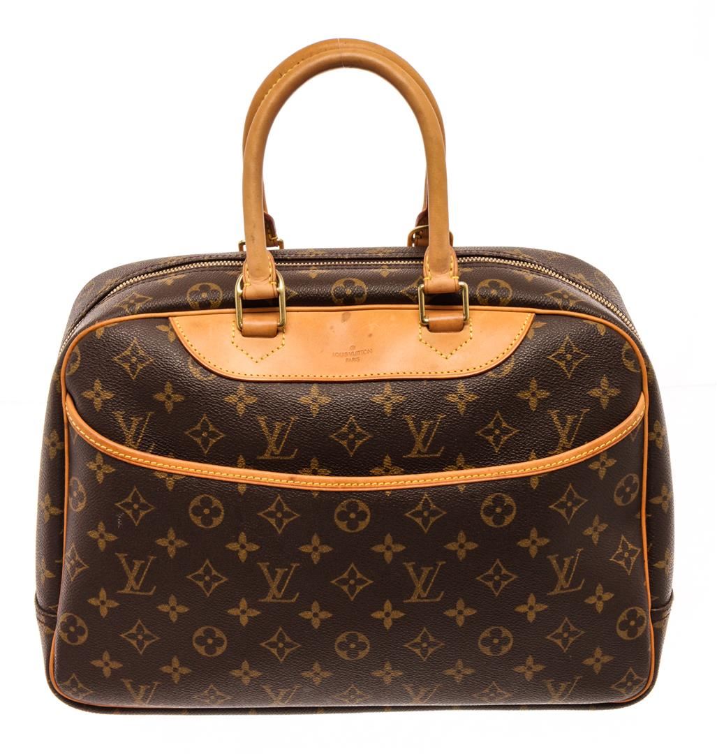 Louis Vuitton Brown Monogram Deauville Shoulder Bag. All available information is listed in the description and shown in the photos. Louis Vuitton Brown Monogram Monogram Deauville Shoulder Bag with brown, printed, antiqued gold-tone hardware, suede lining & single interior pocket, zip closure at top. Height: 11" Width: 13" Depth: 5" Handle Drop: 7"