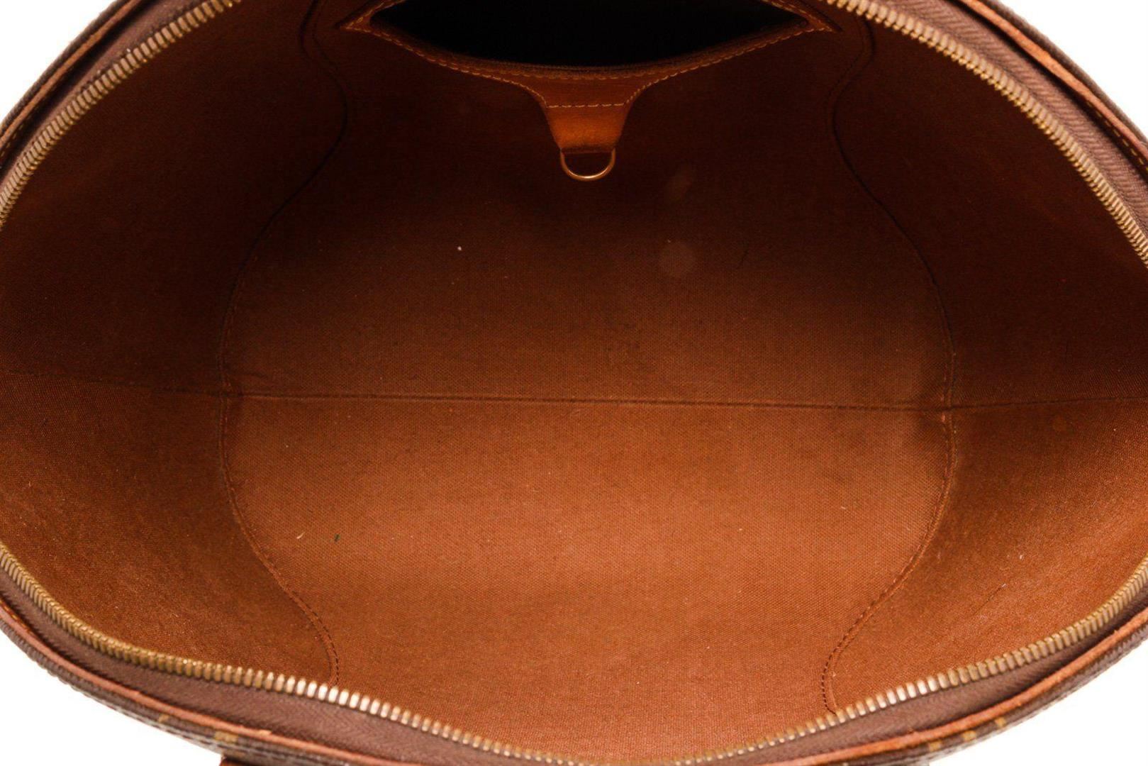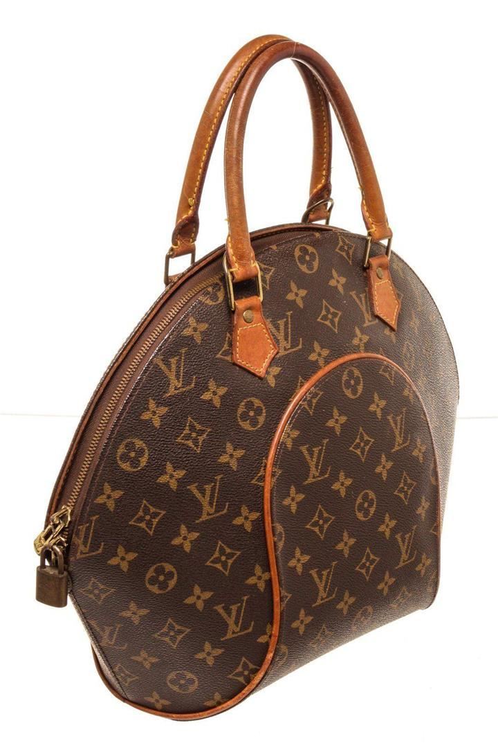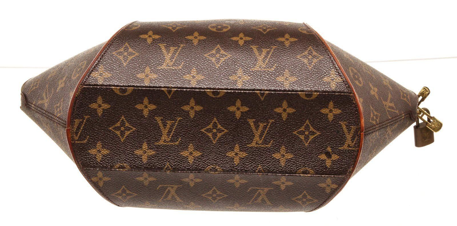 Louis Vuitton Brown Monogram Ellipse MM Shoulder Bag with monogram canvas, gold-tone hardware, trim tan vachetta leather, interior slip pockets, canvas lining, dual top handle and zipper closure.