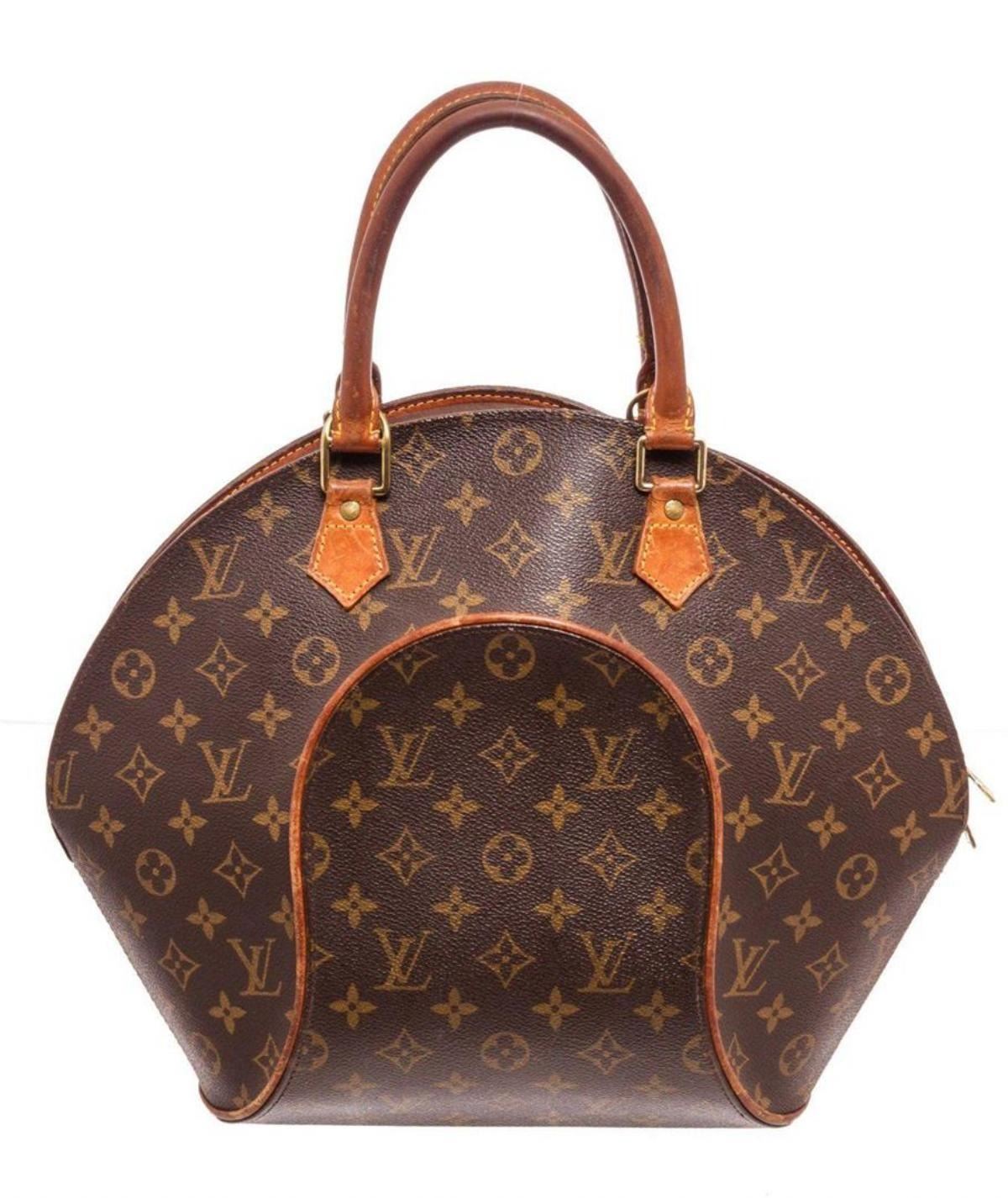 Louis Vuitton Brown Monogram Ellipse MM Stachel Bag. Louis Vuitton Brown Monogram Ellipse MM Stachel Bag with gold-tone hardware, tan vachetta leather accents, dual rolled top handles, brown canvas lining, single pocket at interior wall and two-way zip cl