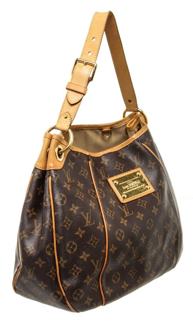 Louis Vuitton Brown Monogram Galliera PM Hobos Bag with monogram canvas, gold-tone hardware, trim tan vachetta leather, interior slip pockets, shoulder straps and snap closure.