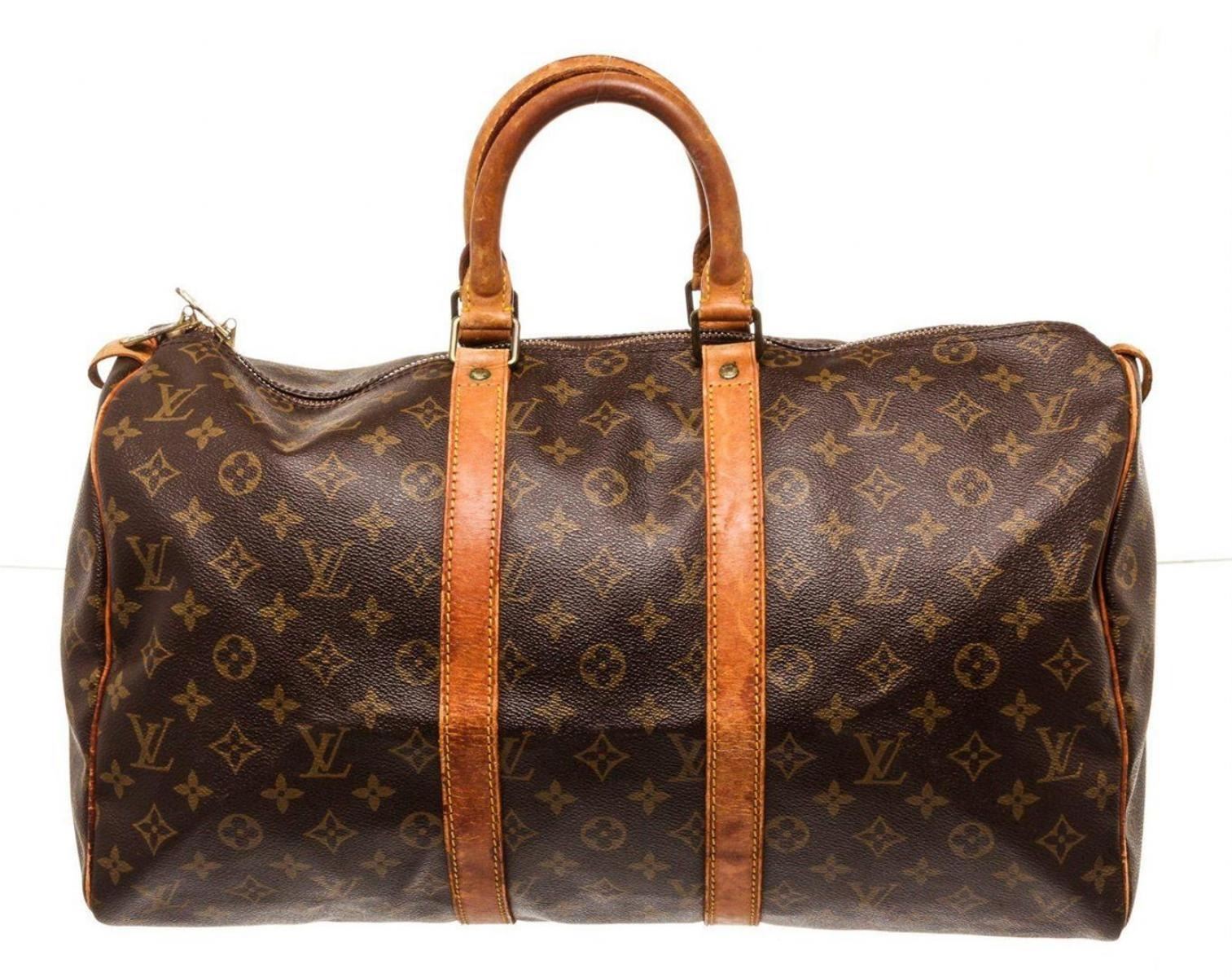 Louis Vuitton Brown Monogram Keepall 45cm Travel Bag. Louis Vuitton Brown Monogram Keepall 45cm Travel Bag with material monogram canvas, gold-tone hardware, interior zip pockets, dual top handles handle, and zip closure.