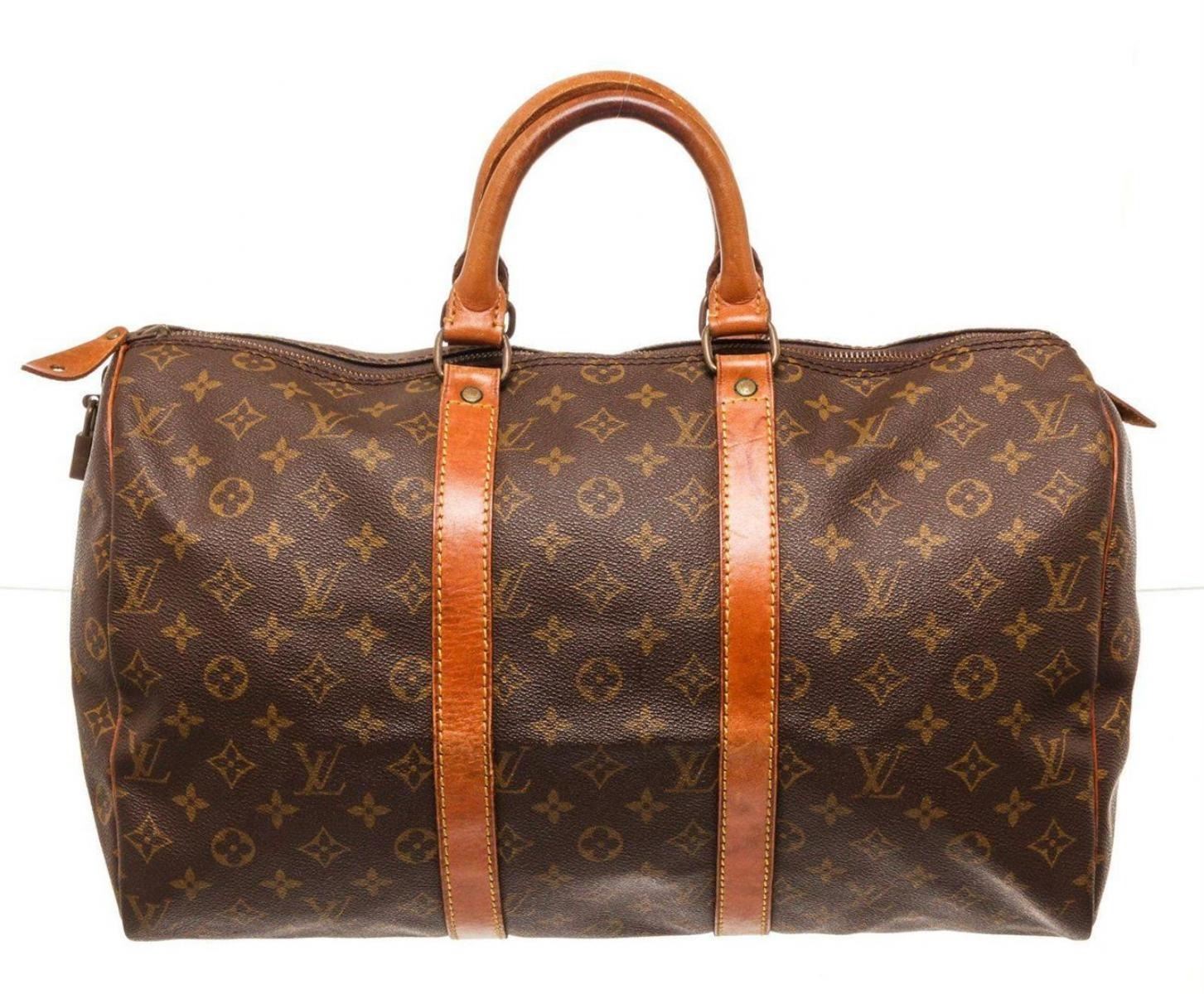 Louis Vuitton Brown Monogram Keepall 45cm Travel Bag. Louis Vuitton Brown Monogram Keepall 45cm Travel Bag with material monogram canvas, gold-tone hardware, interior zip pockets, dual top handles handle, and zip closure.