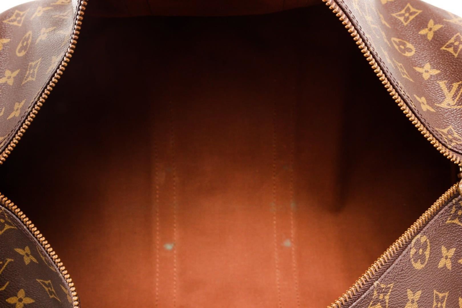 Louis Vuitton Brown Monogram Keepall 45cm Travel Bag with monogram canvas, gold-tone hardware, interior zip pockets, dual top handles handle, and zipper closure.
