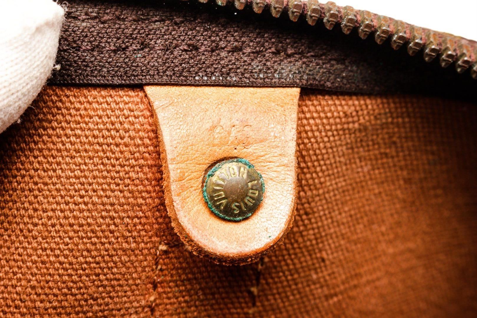 Louis Vuitton Brown Monogram Keepall 45cm Travel Bag with material monogram canvas, gold-tone hardware, interior zip pockets, dual top handles handle, and zip closure.