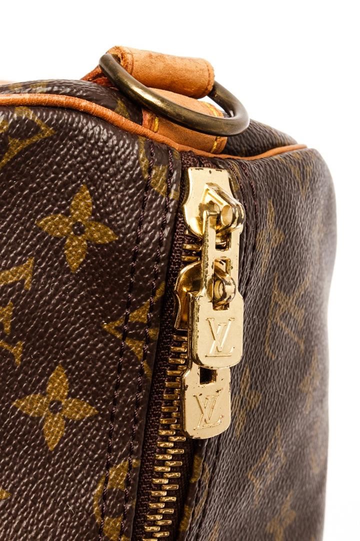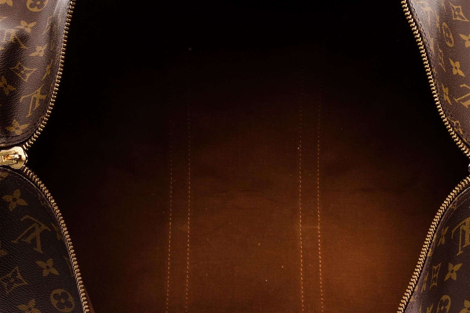 Louis Vuitton Brown Monogram Keepall 55 Bandoulière Travel Bag. All available information is listed in the description and shown in the photos. Louis Vuitton Brown Monogram Keepall 55 Bandoulière Travel Bag with this travel bag features, brown monogram, gold-tone hardware, leather trim, rolled handles, leather trim embellishment, canvas lining, zip closure at top. Height: 12" Width: 21" Depth: 9.25", Handle Drop: 4.5" / 30.48 x 53.34 x 23.49 Cm