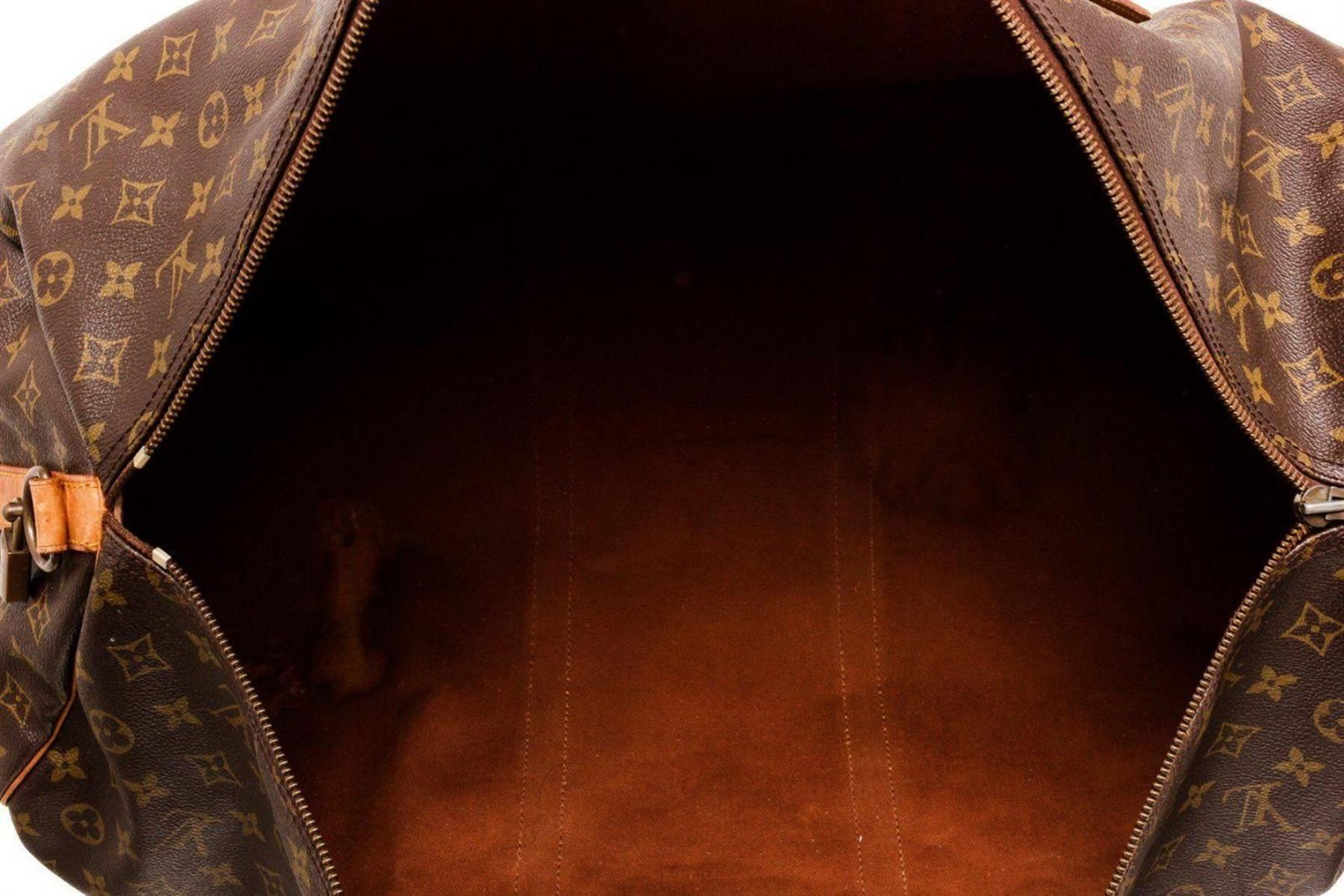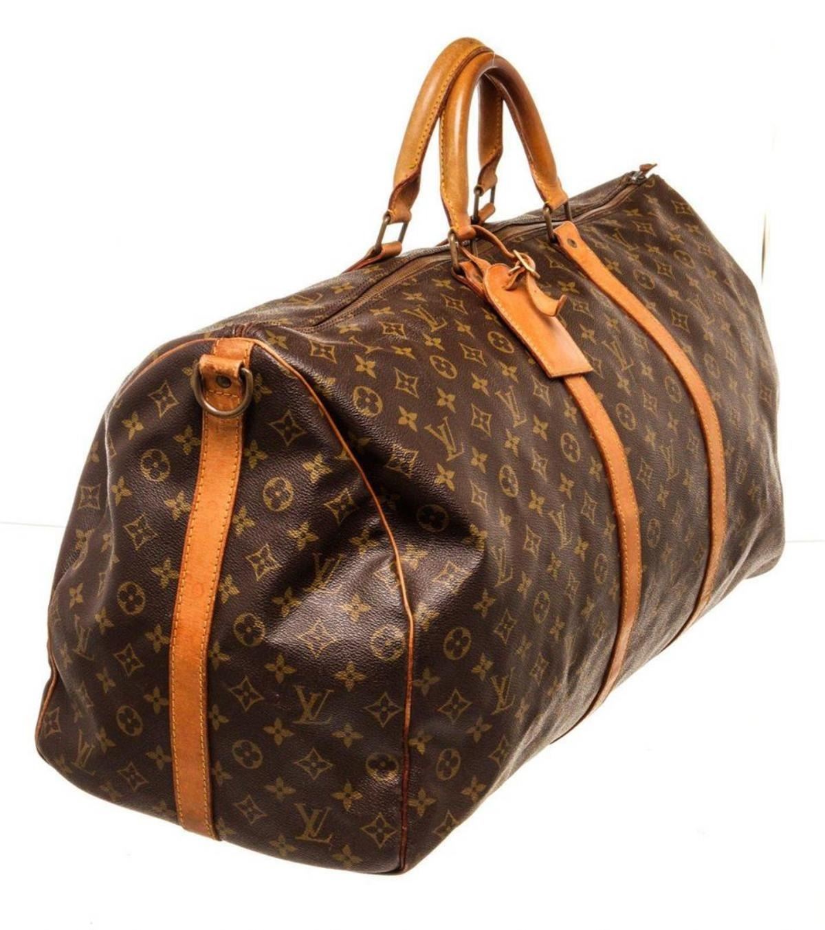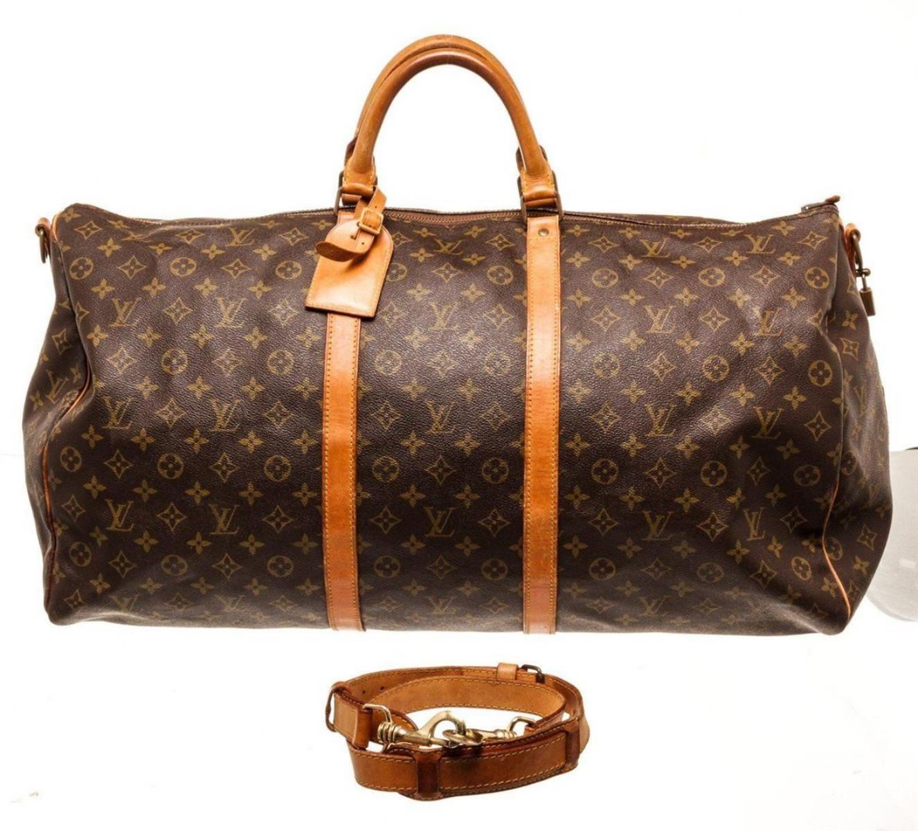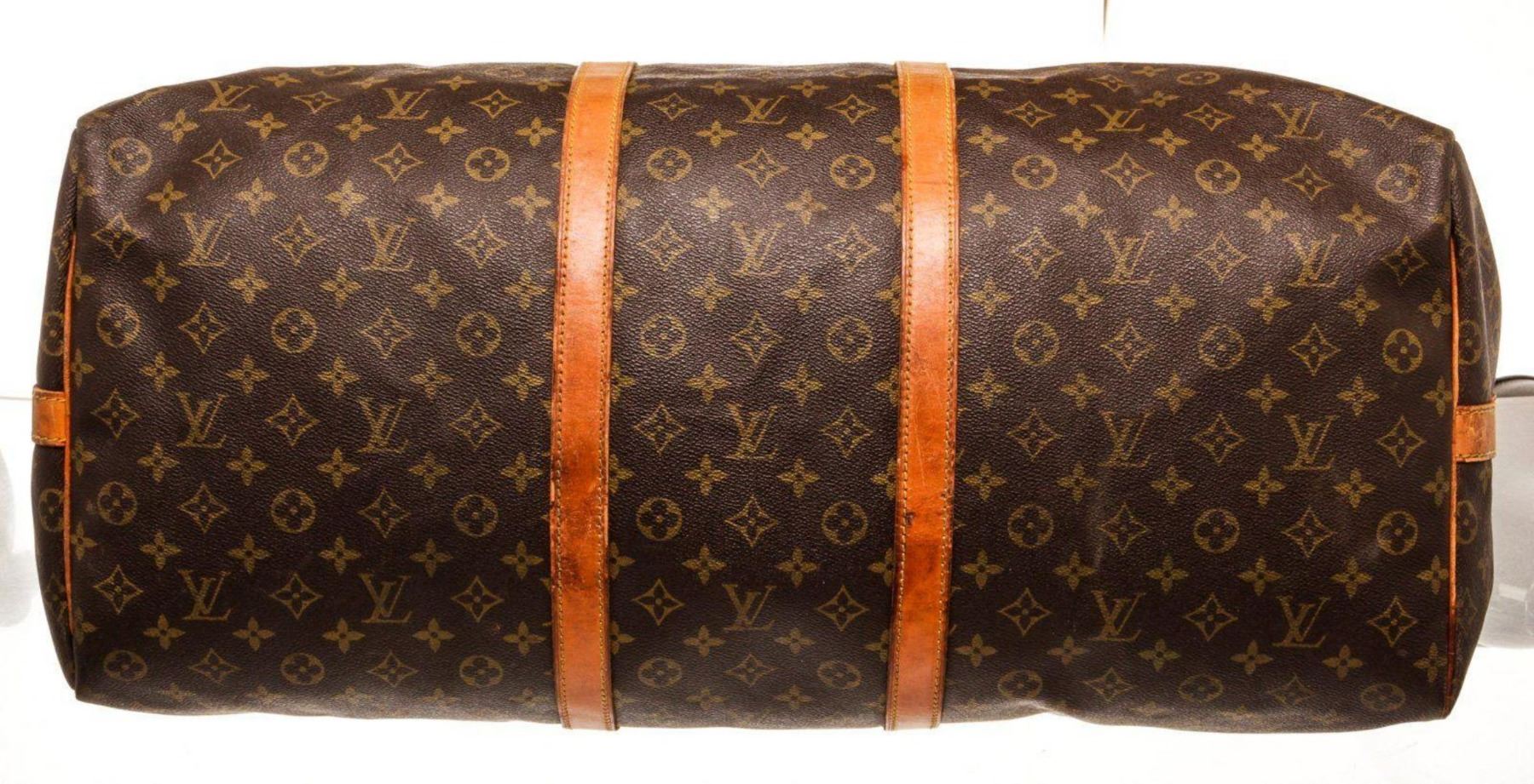 Louis Vuitton Brown Monogram Keepall 60cm Travel Bag with material monogram canvas, tan vachetta leather trim, canvas lining, dual top handle and zipper closure.