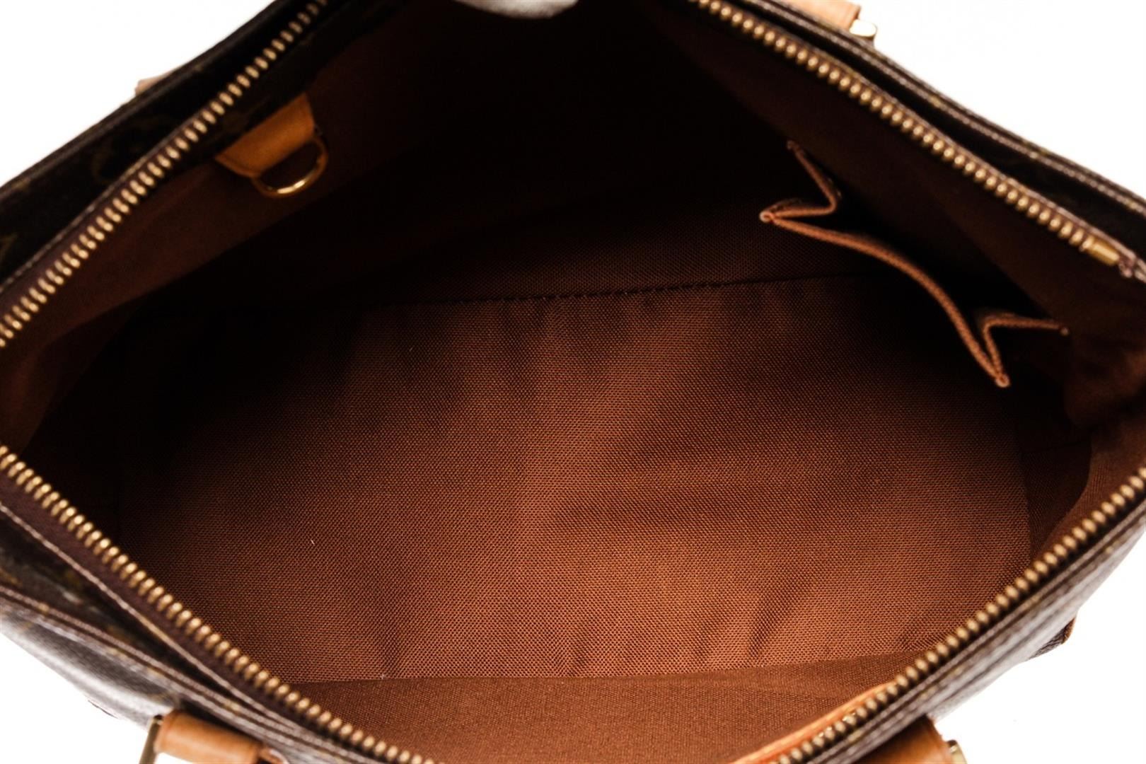 Louis Vuitton Brown Monogram Leather Cabas Piano Tote Bag. All available information is listed in the description and shown in the photos. Louis Vuitton Brown Monogram Leather Cabas Piano Tote Bag with gold-tone hardware, leather trim, dual shoulder straps, leather trim embellishment, canvas lining & single interior pocket, zip closure at top, includes dust bag. Height: 9.5" Width: 11" Depth: 4.5", Shoulder Strap Drop: 9" / 24.13 x 27.94 x 11.43 Cm