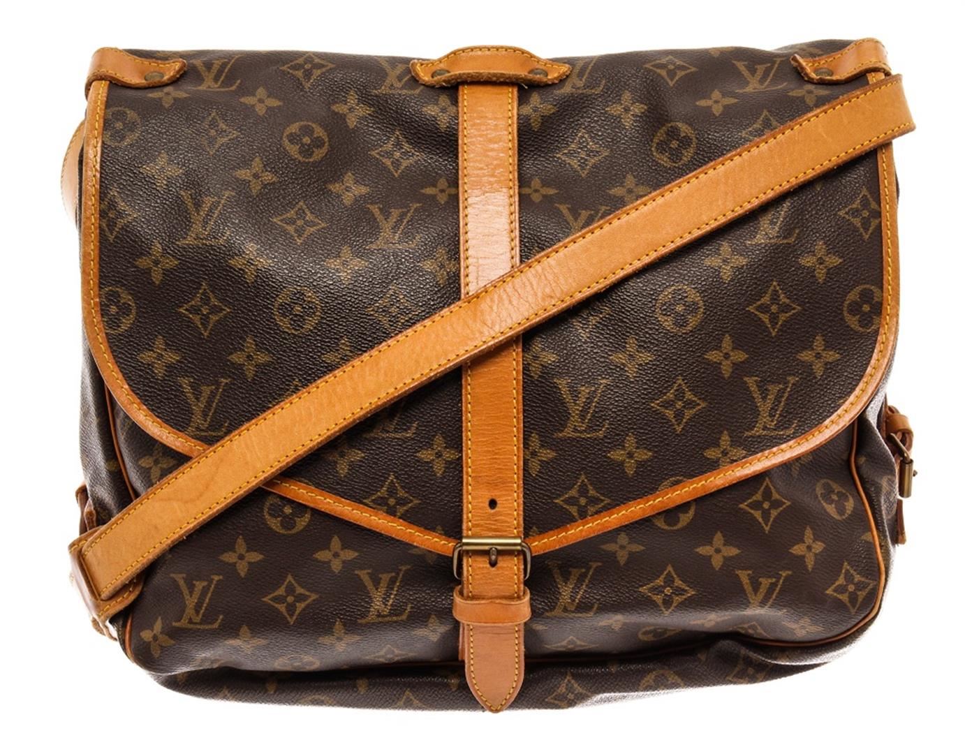 Louis Vuitton Brown Monogram Leather Saumur 30 Messenger Bag. All available information is listed in the description and shown in the photos. Louis Vuitton Brown Monogram Leather Saumur 30 Messenger Bag with brass hardware, single adjustable shoulder strap, leather trim embellishment, canvas lining & single interior pocket, clasp closure at front. Height: 11.75" Width: 11.5" Depth: 3.5", Shoulder Strap Drop: 12.5" / 29.84 x 29.21 x 8.89 Cm