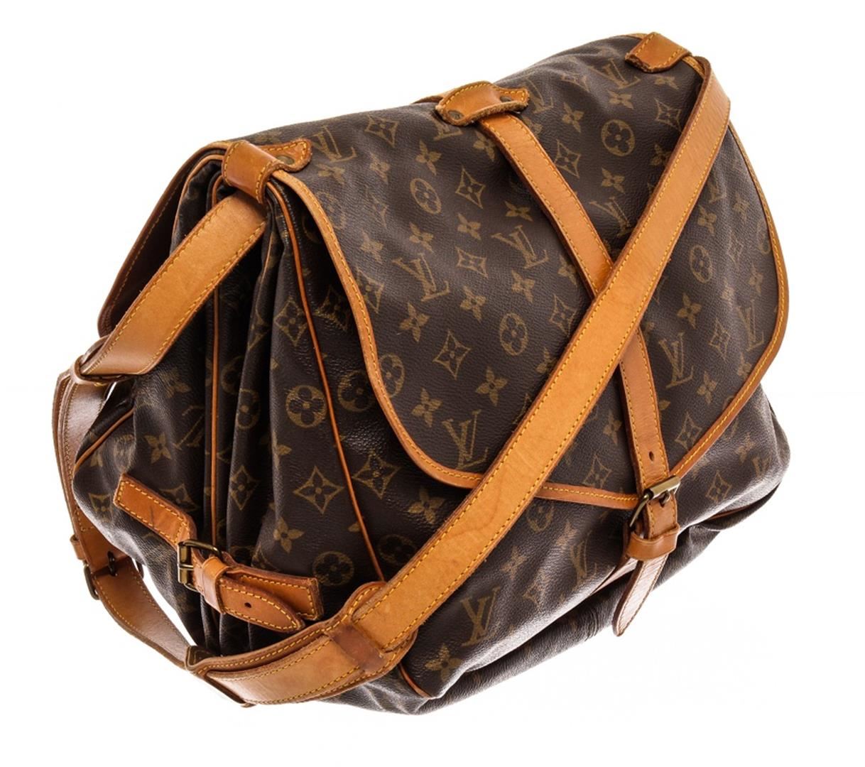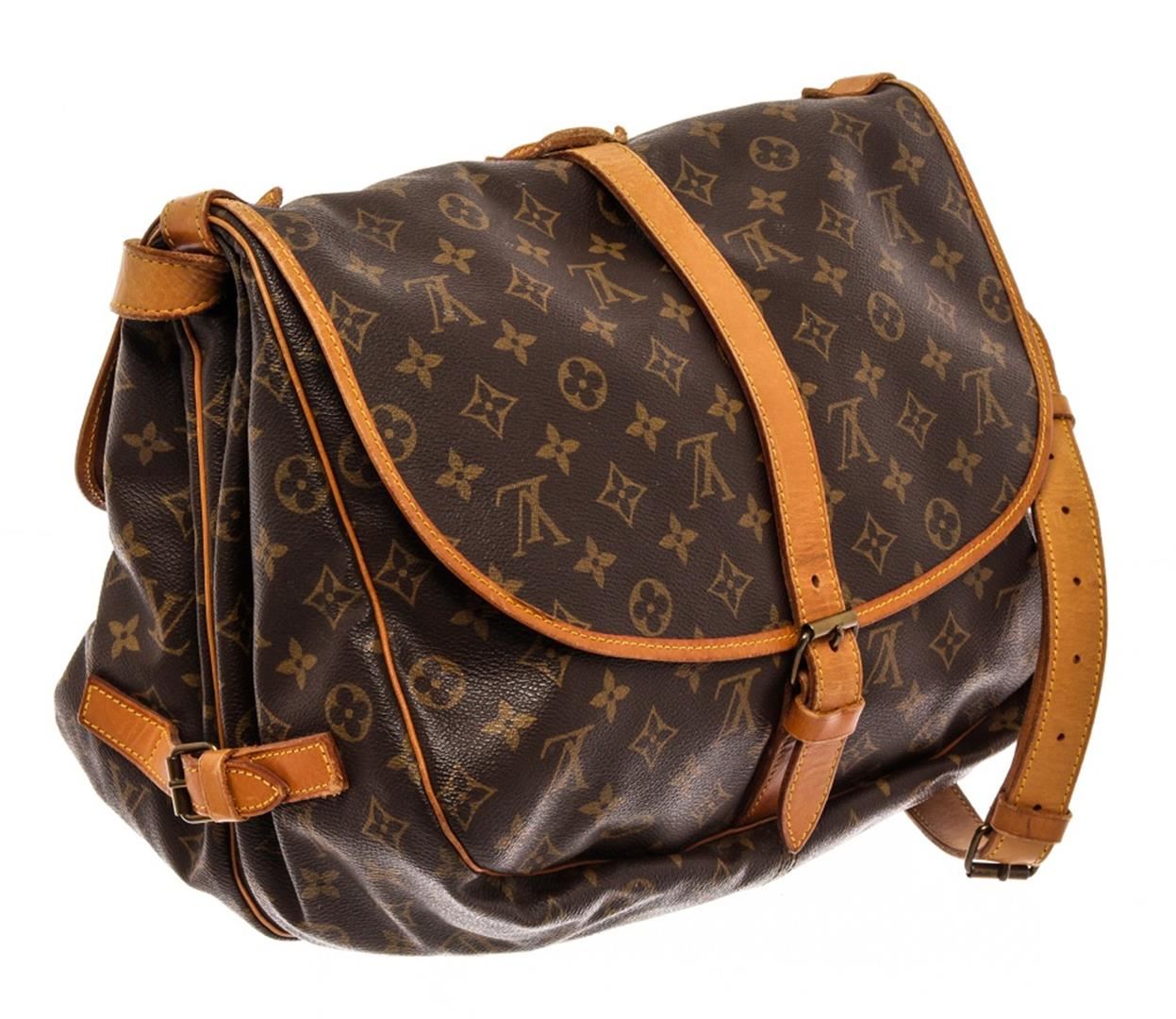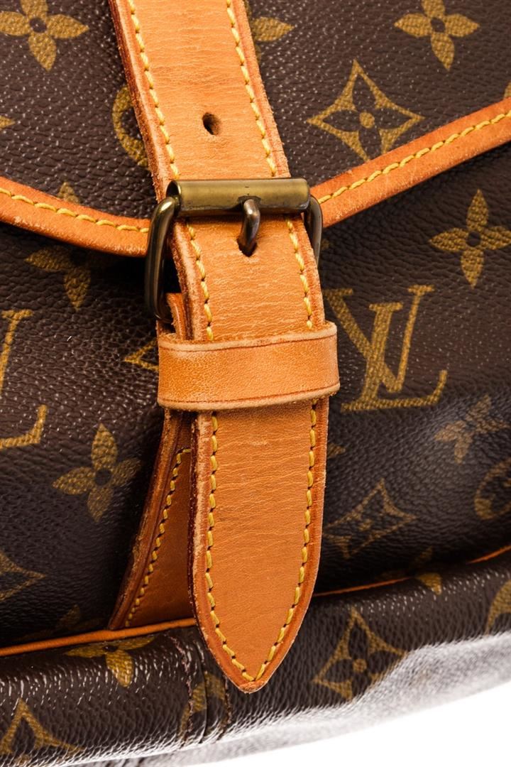 Louis Vuitton Brown Monogram Leather Saumur 30 Messenger Bag. All available information is listed in the description and shown in the photos. Louis Vuitton Brown Monogram Leather Saumur 30 Messenger Bag with brass hardware, single adjustable shoulder strap, leather trim embellishment, canvas lining & single interior pocket, clasp closure at front. Height: 11.75" Width: 11.5" Depth: 3.5", Shoulder Strap Drop: 12.5" / 29.84 x 29.21 x 8.89 Cm