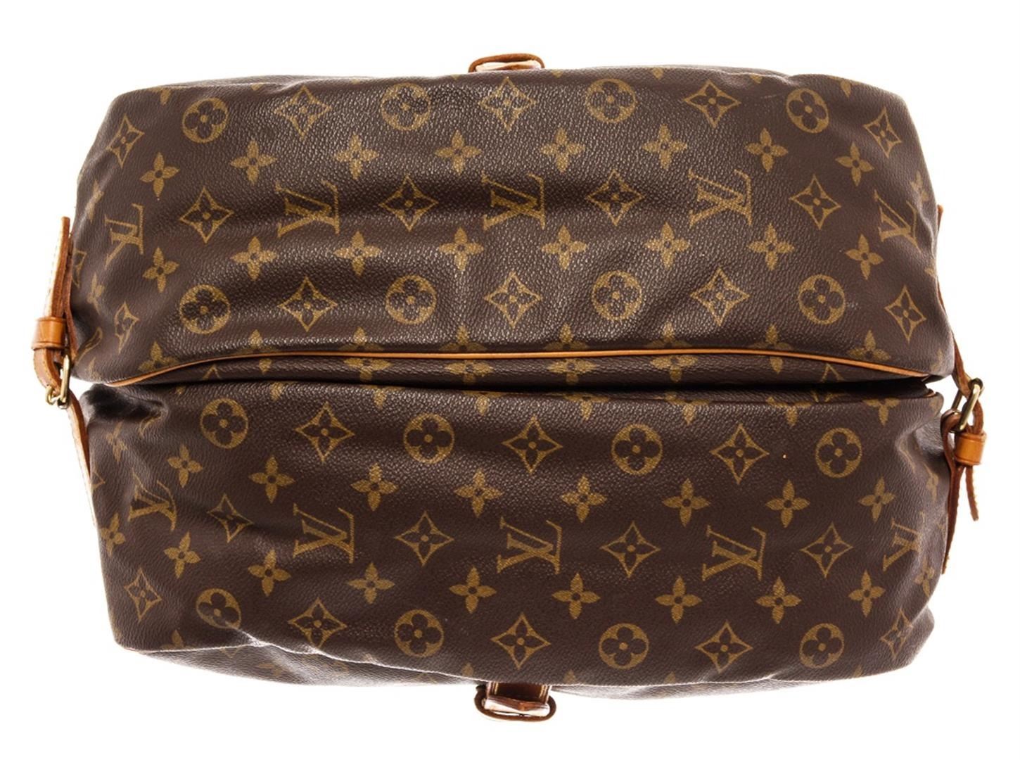 Louis Vuitton Brown Monogram Leather Saumur 35 Messenger Bag. All available information is listed in the description and shown in the photos. Louis Vuitton Brown Monogram Leather Saumur 35 Messenger Bag with brass hardware, leather trim, single adjustable shoulder strap, canvas lining & three interior pockets, buckle closure at front. Height: 10" Width: 11.5" Depth: 2", Shoulder Strap Drop: 18.5-23" / 25.4 x 29.21 x 5.08 Cm