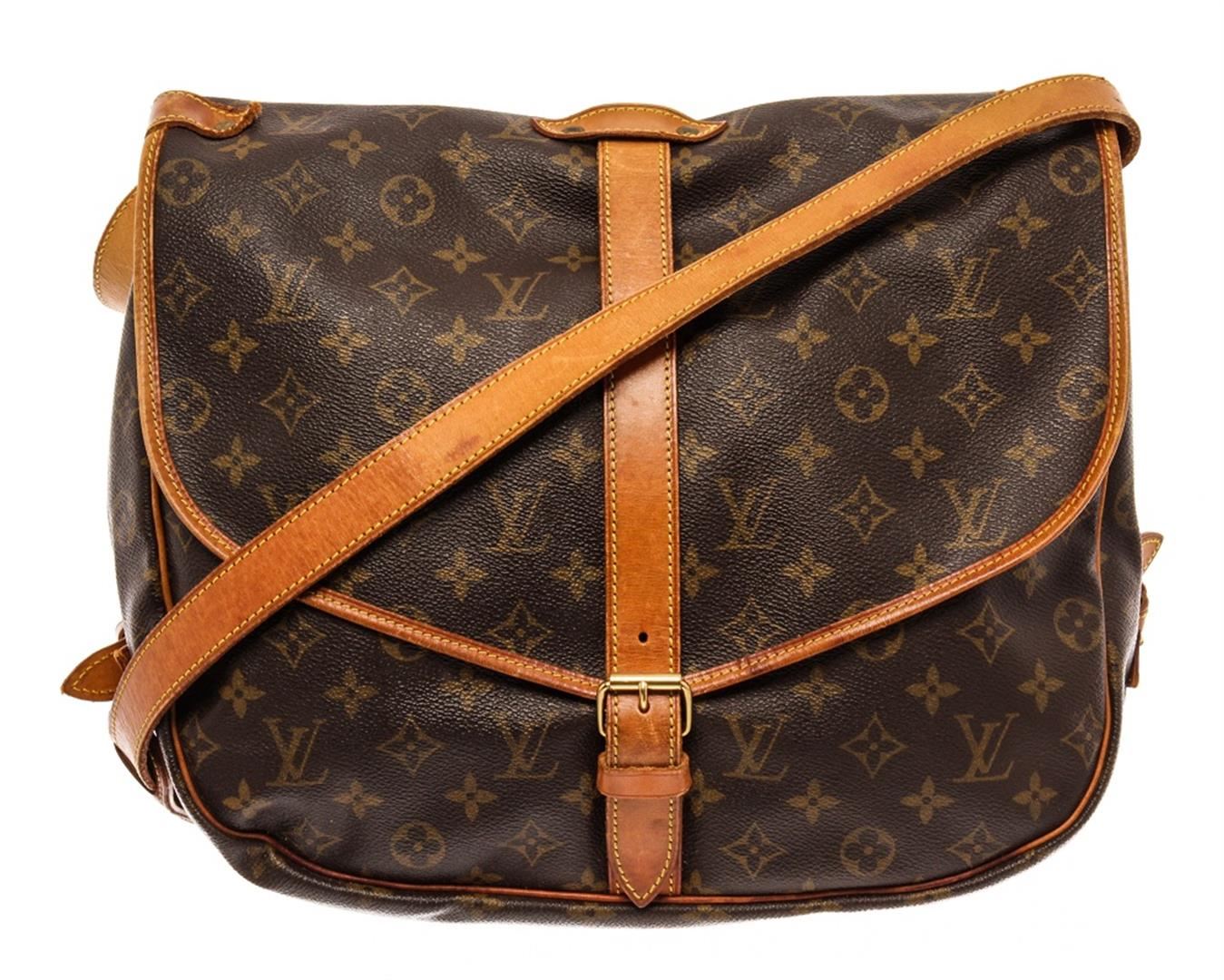 Louis Vuitton Brown Monogram Leather Saumur 35 Shoulder Bag. All available information is listed in the description and shown in the photos. Louis Vuitton Brown Monogram Leather Saumur 35 Shoulder Bag with brass hardware, leather trim, single adjustable shoulder strap, canvas lining & three interior pockets, buckle closure at front. Height: 10" Width: 11.5" Depth: 2", Shoulder Strap Drop: 18.5-23" / 25.4 x 29.21 x 5.08 Cm