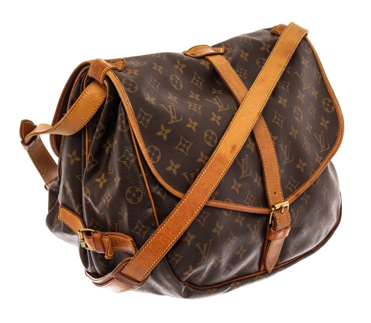 Louis Vuitton Brown Monogram Leather Saumur 35 Shoulder Bag. All available information is listed in the description and shown in the photos. Louis Vuitton Brown Monogram Leather Saumur 35 Shoulder Bag with brass hardware, leather trim, single adjustable shoulder strap, canvas lining & three interior pockets, buckle closure at front. Height: 10" Width: 11.5" Depth: 2", Shoulder Strap Drop: 18.5-23" / 25.4 x 29.21 x 5.08 Cm