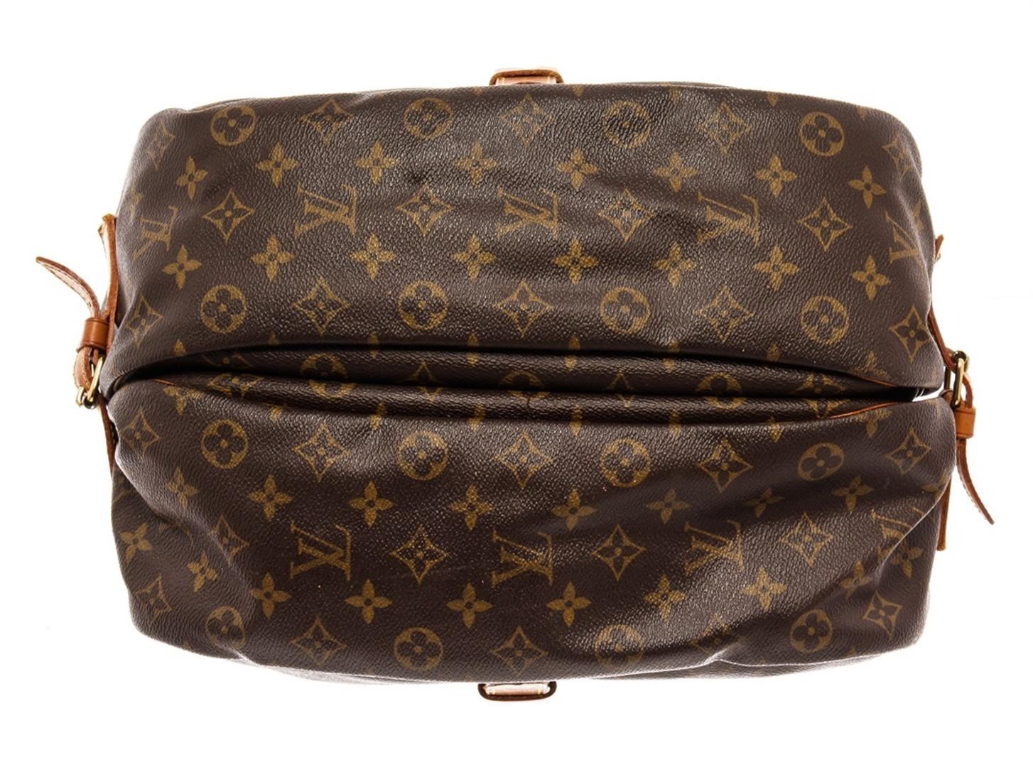 Louis Vuitton Brown Monogram Leather Saumur 35 Shoulder Bag. All available information is listed in the description and shown in the photos. Louis Vuitton Brown Monogram Leather Saumur 35 Shoulder Bag with brass hardware, leather trim, single adjustable shoulder strap, canvas lining & three interior pockets, buckle closure at front. Height: 10" Width: 11.5" Depth: 2", Shoulder Strap Drop: 18.5-23" / 25.4 x 29.21 x 5.08 Cm