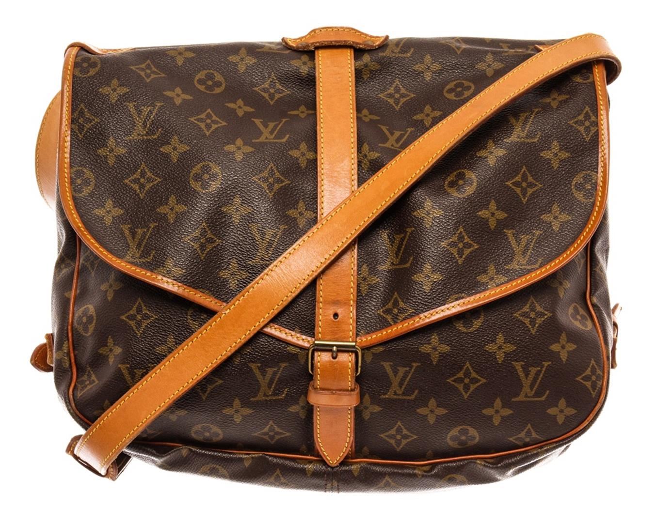 Louis Vuitton Brown Monogram Leather Saumur 35cm Shoulder Bag. All available information is listed in the description and shown in the photos. Louis Vuitton Brown Monogram Leather Saumur 35cm Shoulder Bag with vintage, brass hardware, leather trim, single adjustable shoulder strap, leather trim embellishment, canvas lining & three interior pockets, buckle closures at front & back. Height: 12" Width: 12.5" Depth: 5.75", Shoulder Strap Drop: 16" / 30.48 x 31.75 x 14.60 Cm