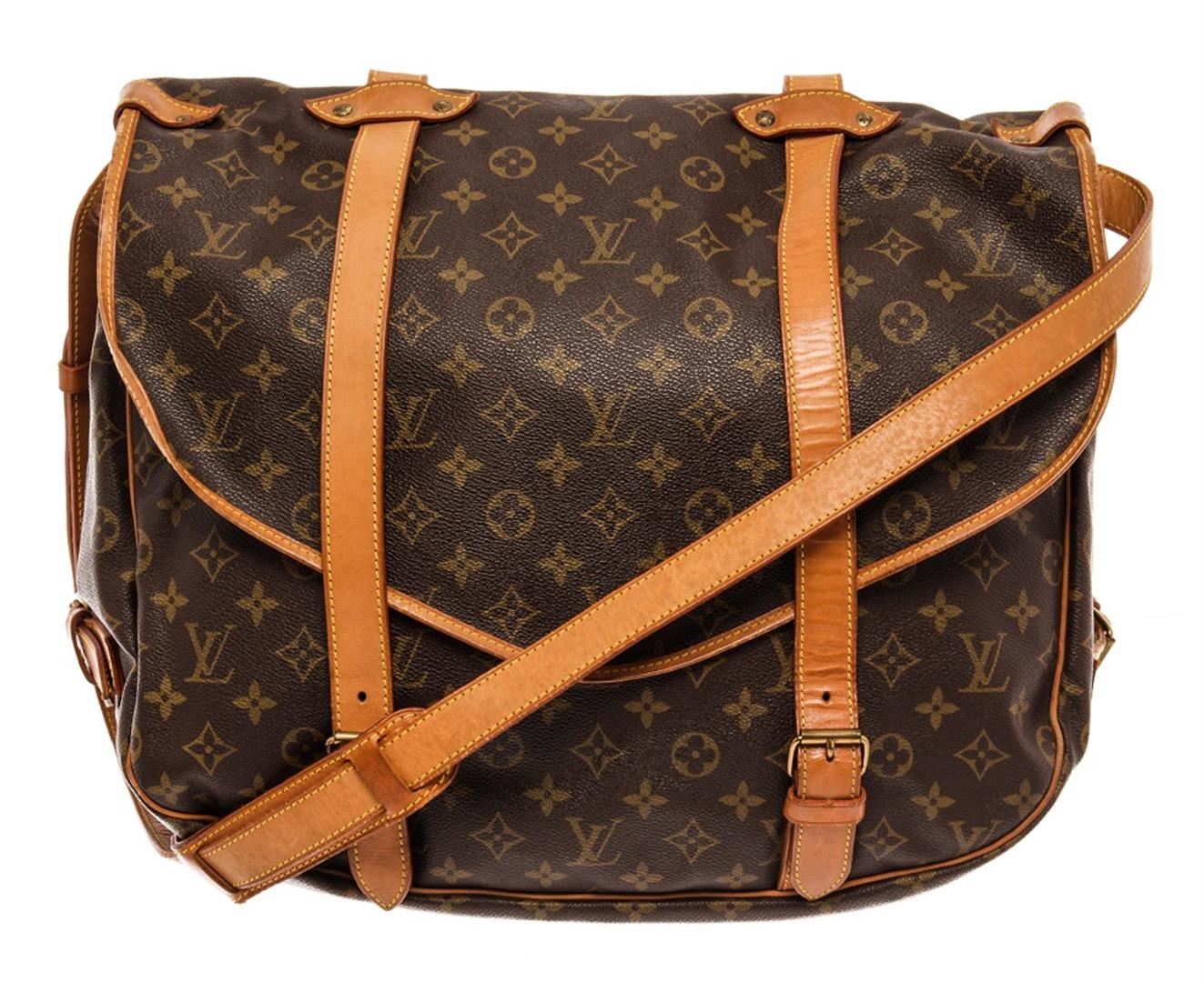Louis Vuitton Brown Monogram Leather Saumur 43 Crossbody Bag. All available information is listed in the description and shown in the photos. Louis Vuitton Brown Monogram Leather Saumur 43 Crossbody Bag with gold-tone hardware, tan vachetta leather accents, adjustable flat shoulder strap, brown canvas interior, dual interior compartments, three pockets at interior walls and four buckle closures at exterior. Height: 12" Width: 9.5" Depth: 16.9", / 30.48 x 24.13 x 42.93 Cm