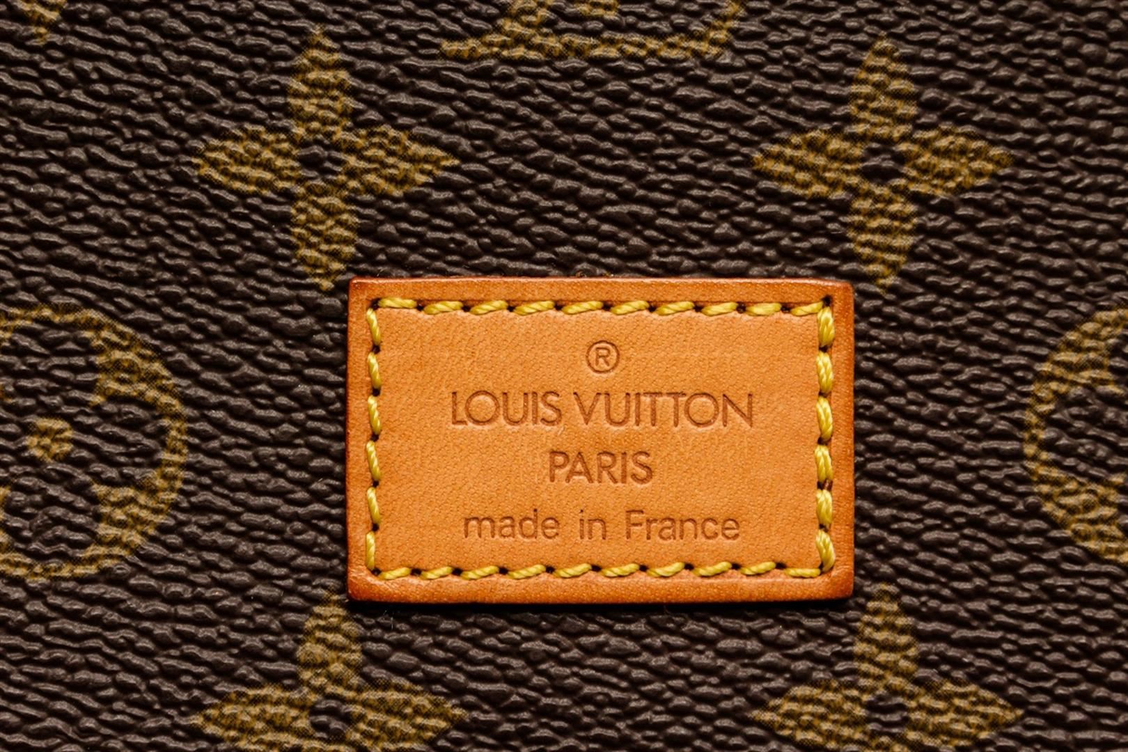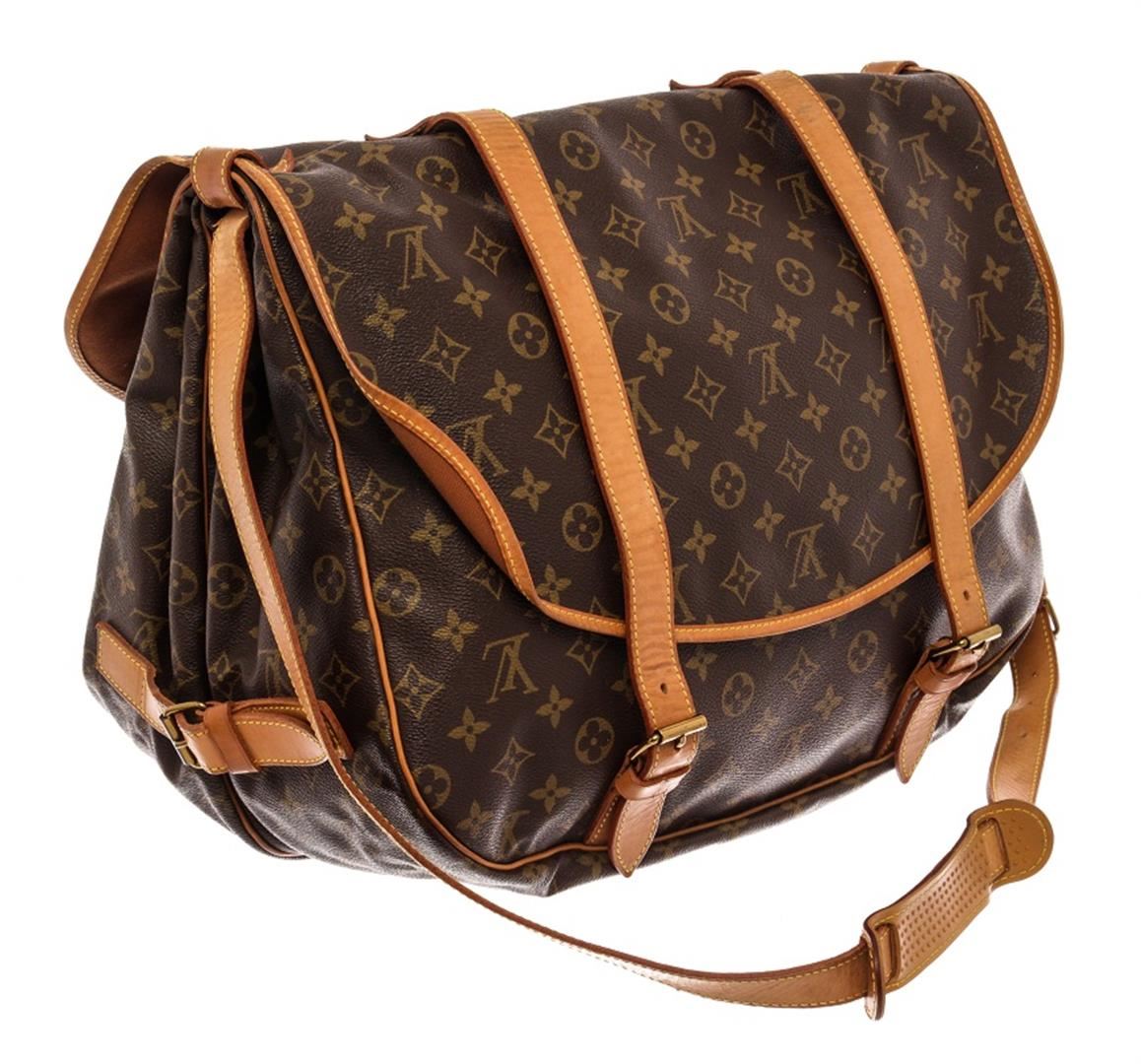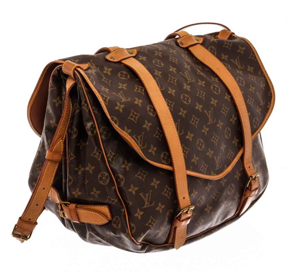 Louis Vuitton Brown Monogram Leather Saumur 43 Crossbody Bag. All available information is listed in the description and shown in the photos. Louis Vuitton Brown Monogram Leather Saumur 43 Crossbody Bag with gold-tone hardware, tan vachetta leather accents, adjustable flat shoulder strap, brown canvas interior, dual interior compartments, three pockets at interior walls and four buckle closures at exterior. Height: 12" Width: 9.5" Depth: 16.9", / 30.48 x 24.13 x 42.93 Cm