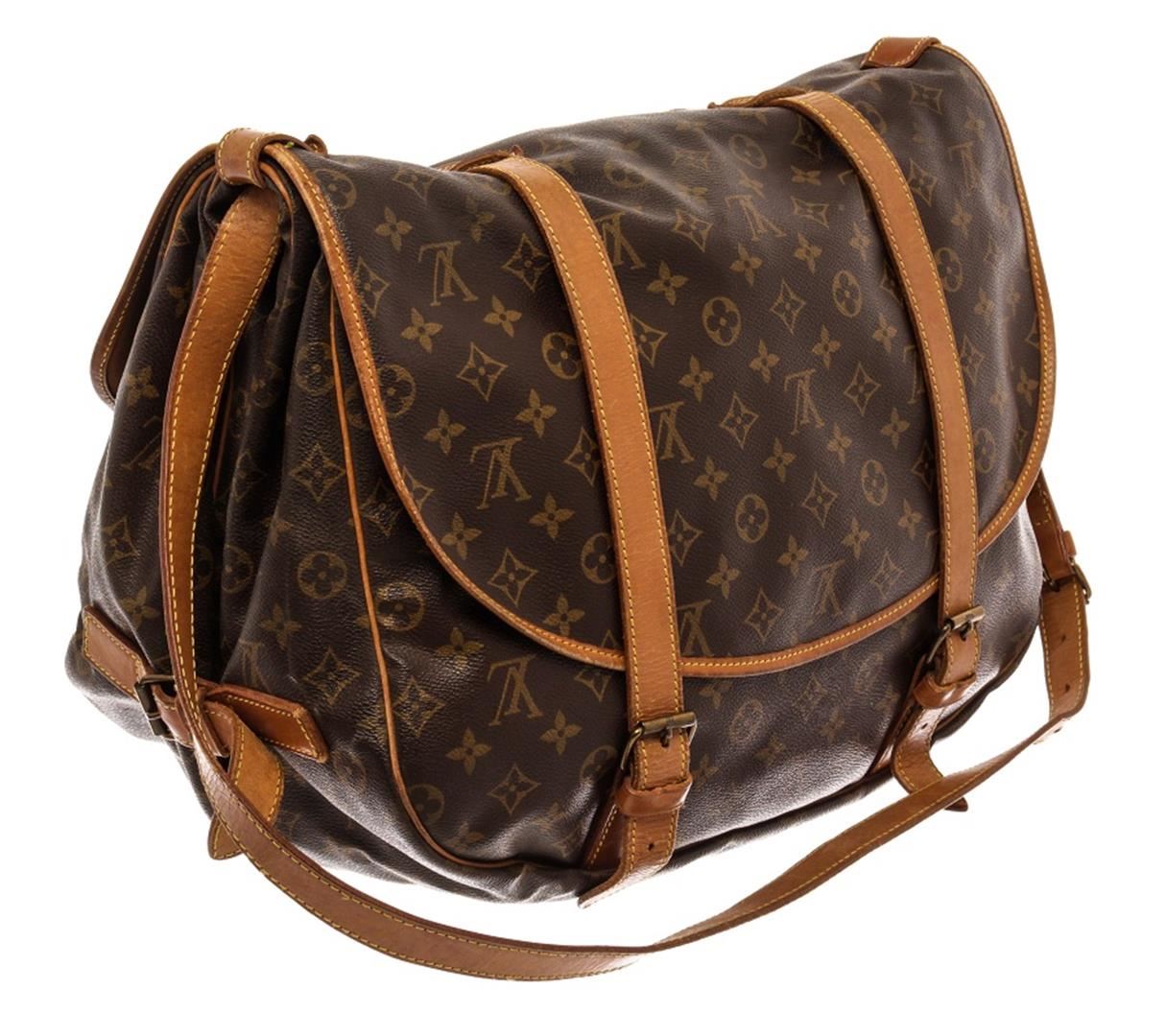 Louis Vuitton Brown Monogram Leather Saumur 43cm Shoulder Bag. All available information is listed in the description and shown in the photos. Louis Vuitton Brown Monogram Leather Saumur 43cm Shoulder Bag with vintage, brown coated canvas, brass hardware, single adjustable shoulder strap, leather trim embellishment, canvas lining & three interior pockets, buckle closure at front, includes dust bag. Height: 13.75" Width: 17" Depth: 8.25", Shoulder Strap Drop Max: 19.5" / 34.92 x 43.18 x 20.95 Cm