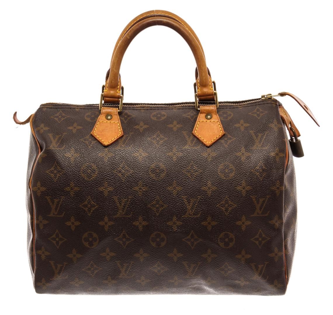 Louis Vuitton Brown Monogram Leather Speedy 30 Satchel Bag. All available information is listed in the description and shown in the photos. Louis Vuitton Brown Monogram Leather Speedy 30 Satchel Bag with brown & neutrals, brass hardware, leather trim, rolled handles, leather trim embellishment, grosgrain lining & single interior pocket, zip closure at top. Height: 8.25" Width: 11.75" Depth: 6.75", Handle Drop: 3" / 20.95 x 29.84 x 17.14 Cm